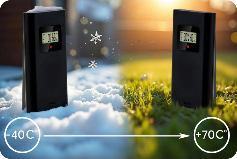 - Larges plages de mesure : intérieur -9,9 à 50 °C, extérieur -40 à 70 °C, humidité 20–95 % HR, pression 850–1100 hPa