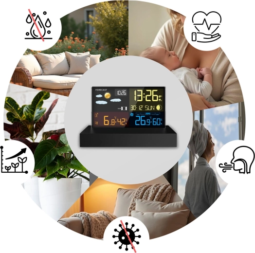 L’heure radio-pilotée DCF, le réveil avec fonction répétition et l’indicateur de confort aident à gérer le rythme quotidien et un climat intérieur sain.