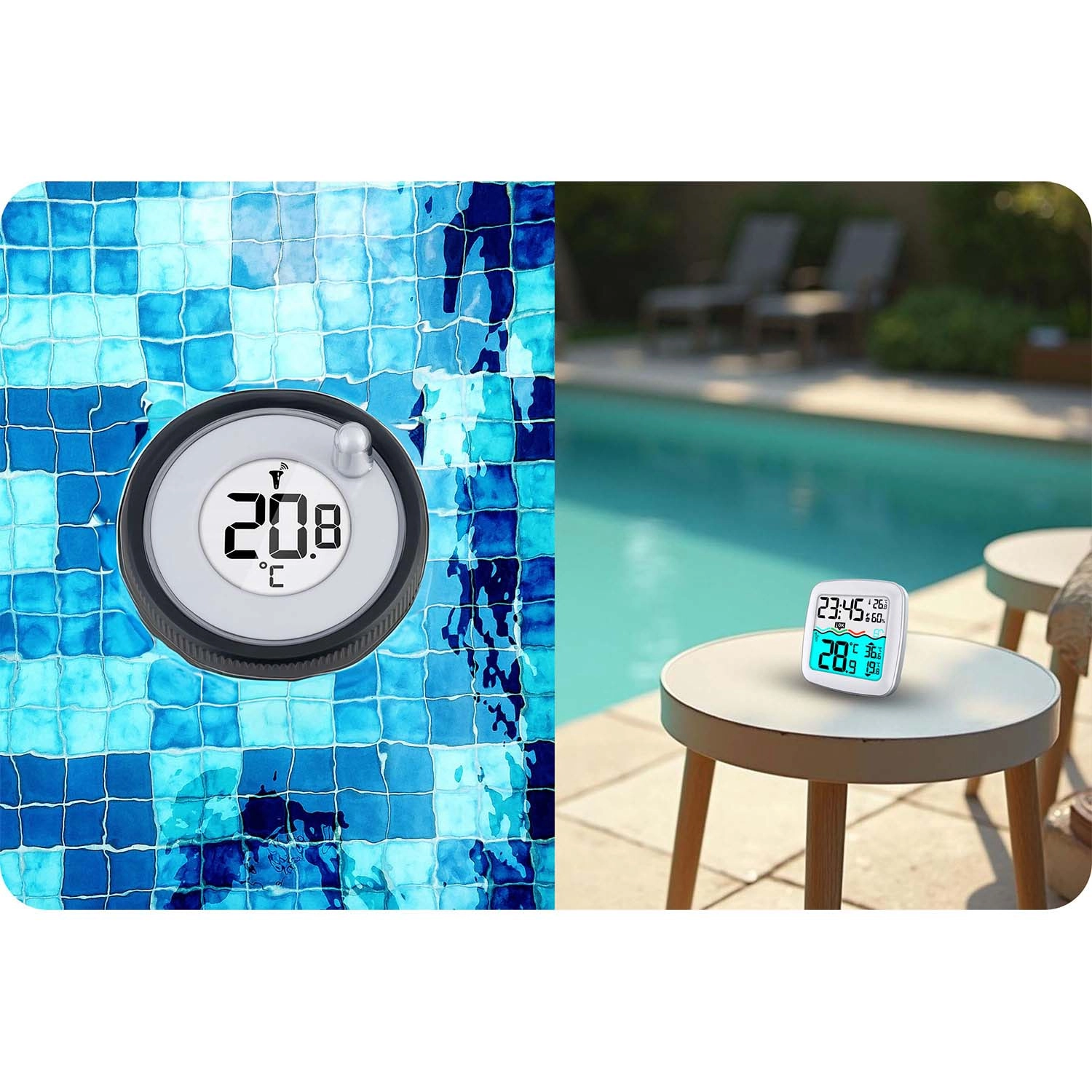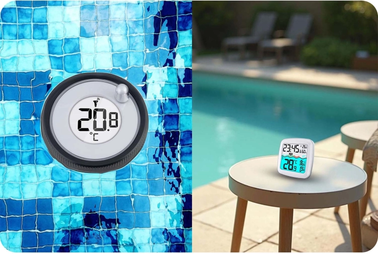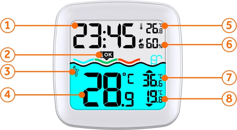 Le grand écran LCD affiche l’heure, l’humidité, la température intérieure et de l’eau, ainsi que les valeurs min/max. Tout est lisible d’un seul coup d’œil.