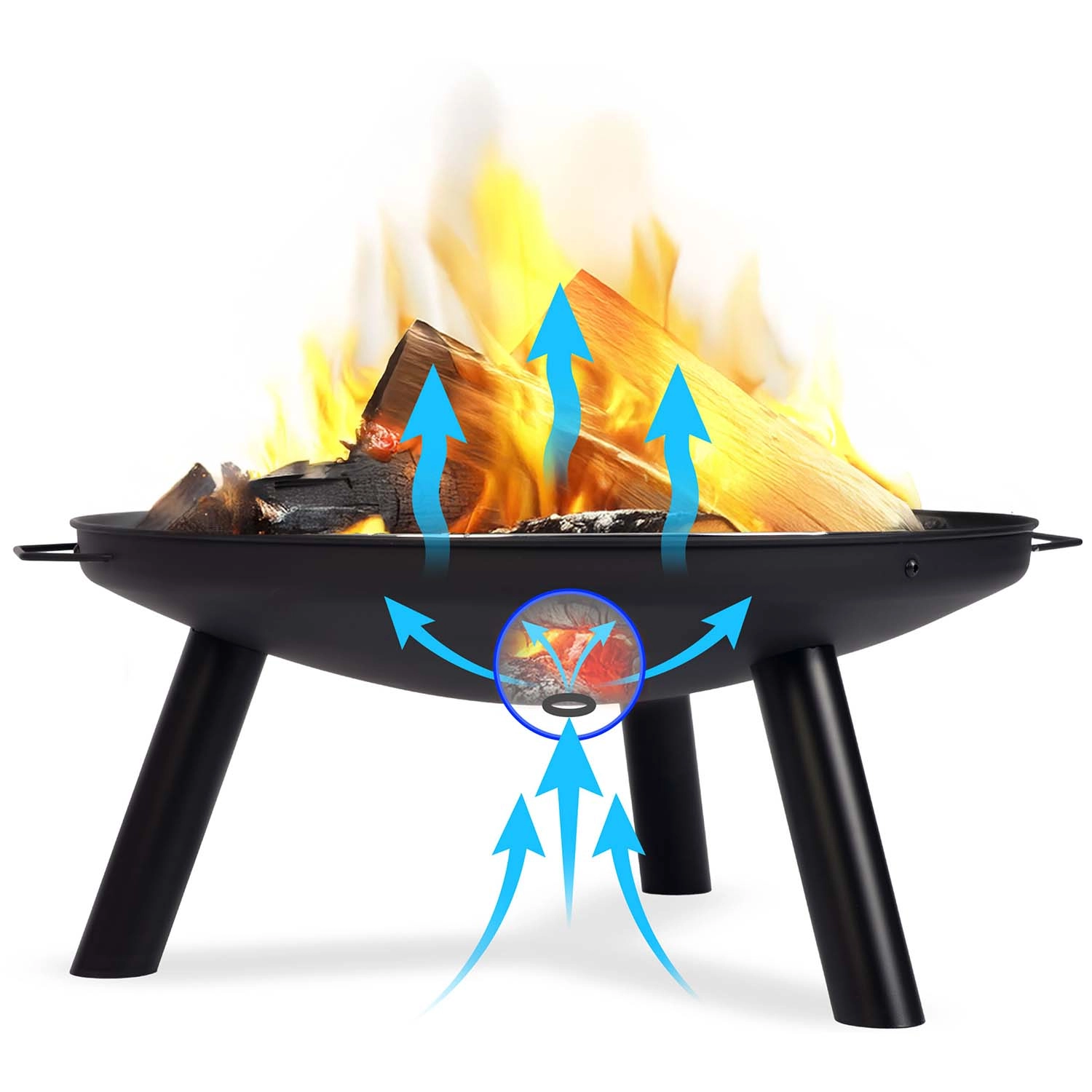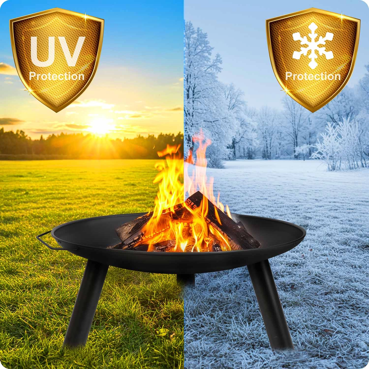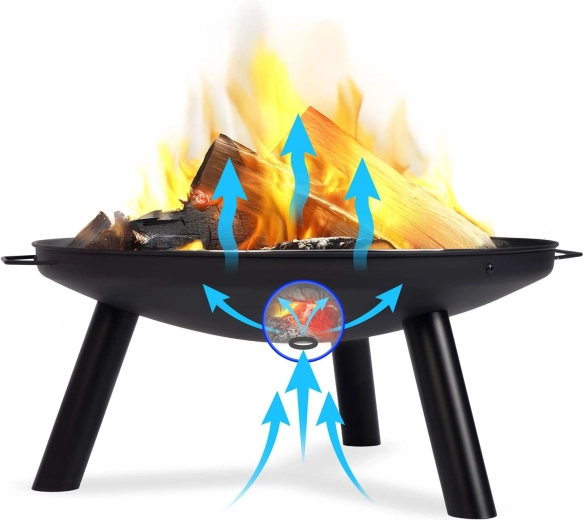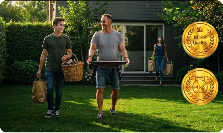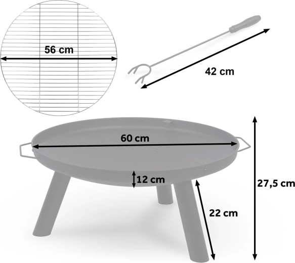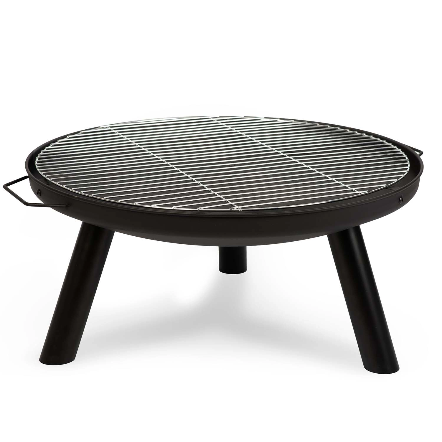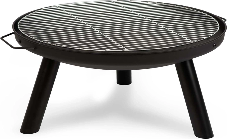 Trois pieds robustes et une cuve en acier large et peu profonde assurent stabilité et diffusion efficace de la chaleur. Les poignées latérales facilitent le déplacement dans le jardin.