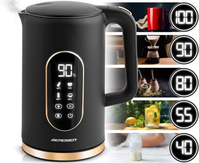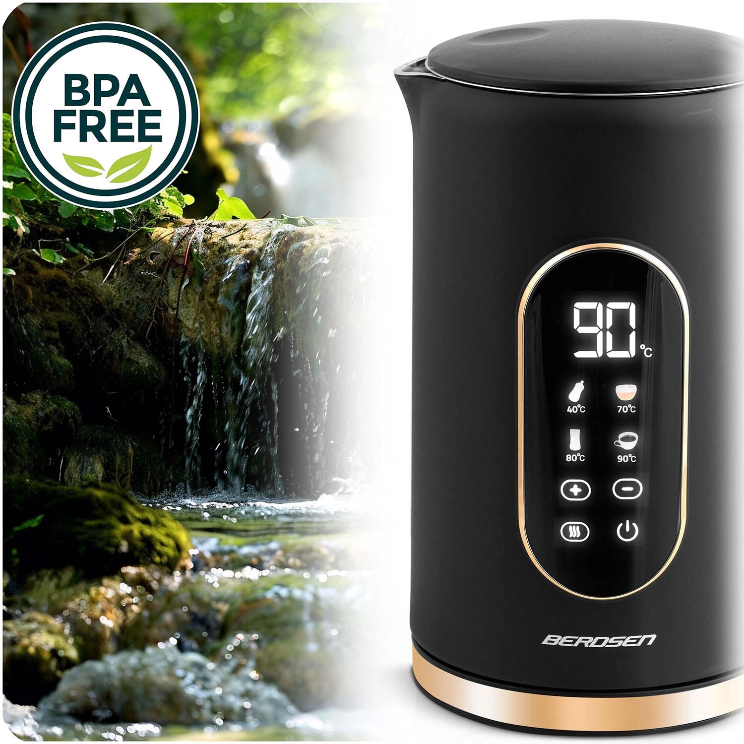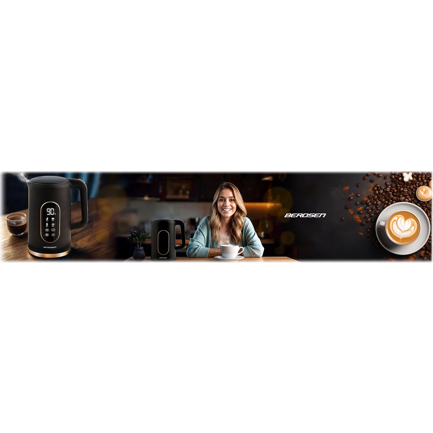 Commande tactile Soft Touch, préréglages 40/70/80/90/100 °C et ajustement fin par pas de 5 °C. Idéal pour le café, les thés et les boissons pour enfants, avec fonction de maintien au chaud jusqu’à 2 heures.