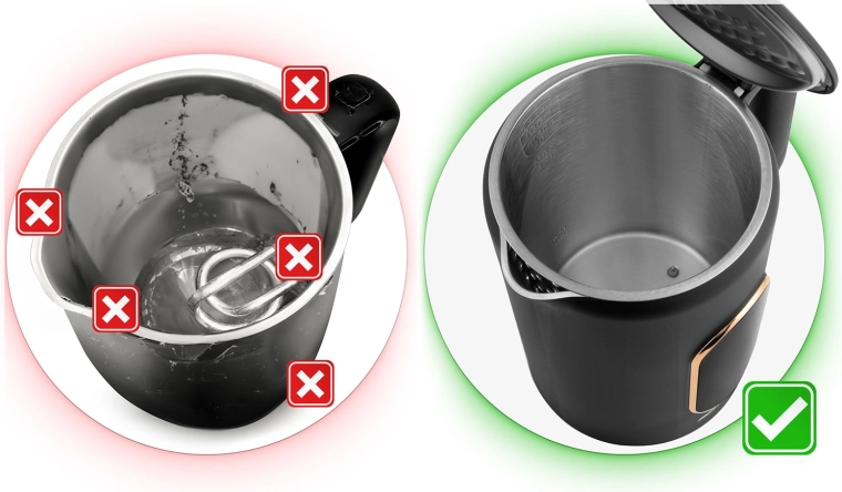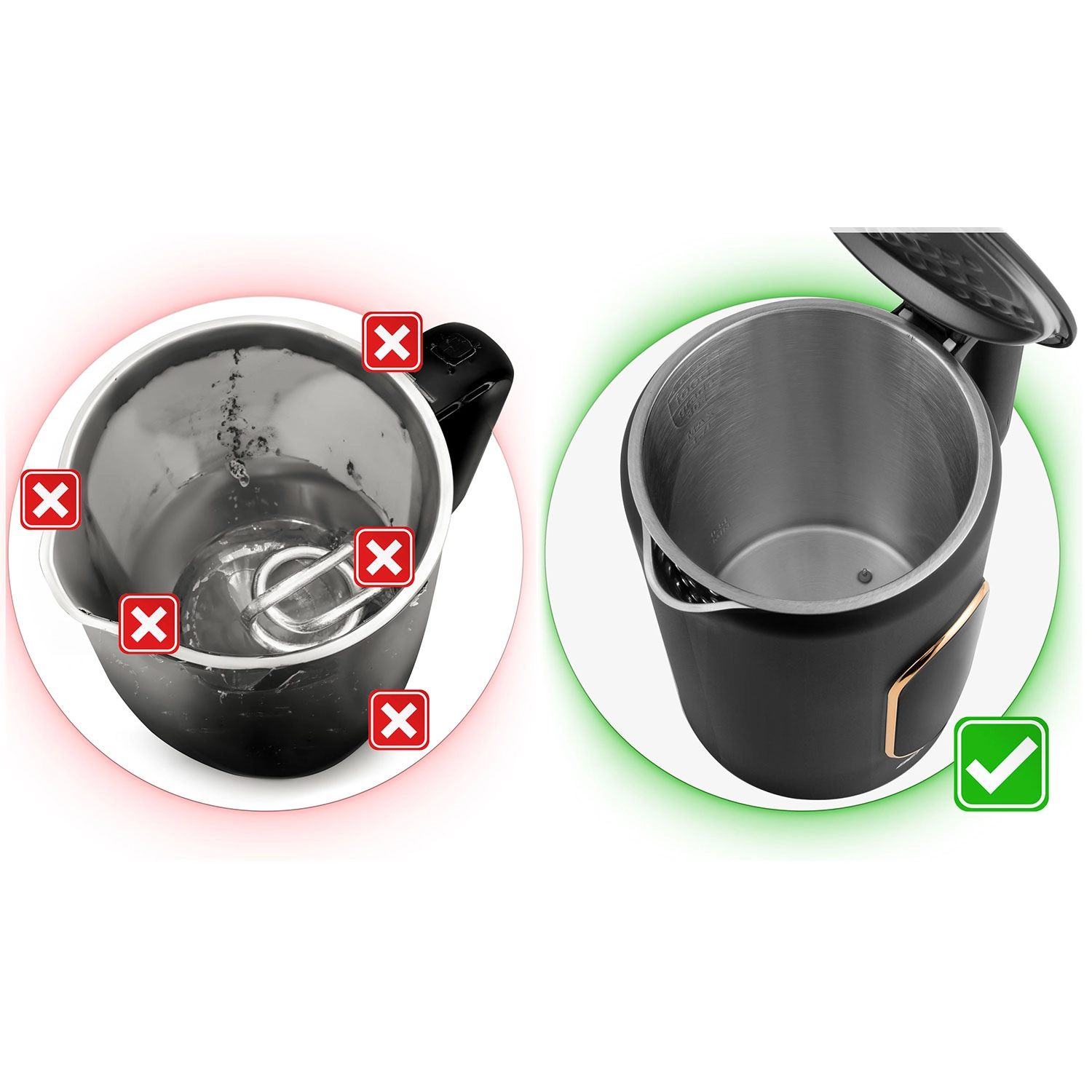 Parois intérieures lisses en inox SUS 304 sans recoins pour faciliter l’entretien, améliorer le goût de l’eau et prolonger la durée de vie de la bouilloire. Sans BPA.