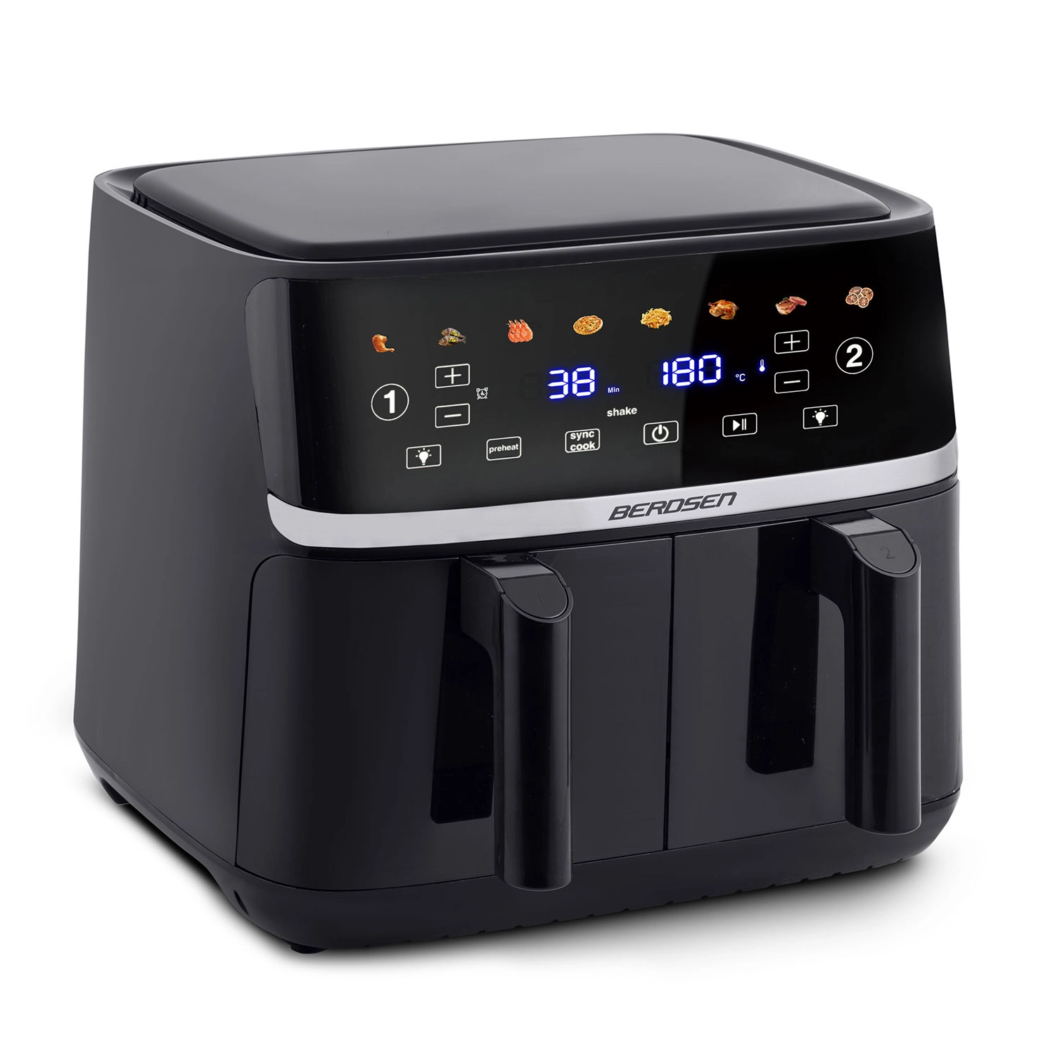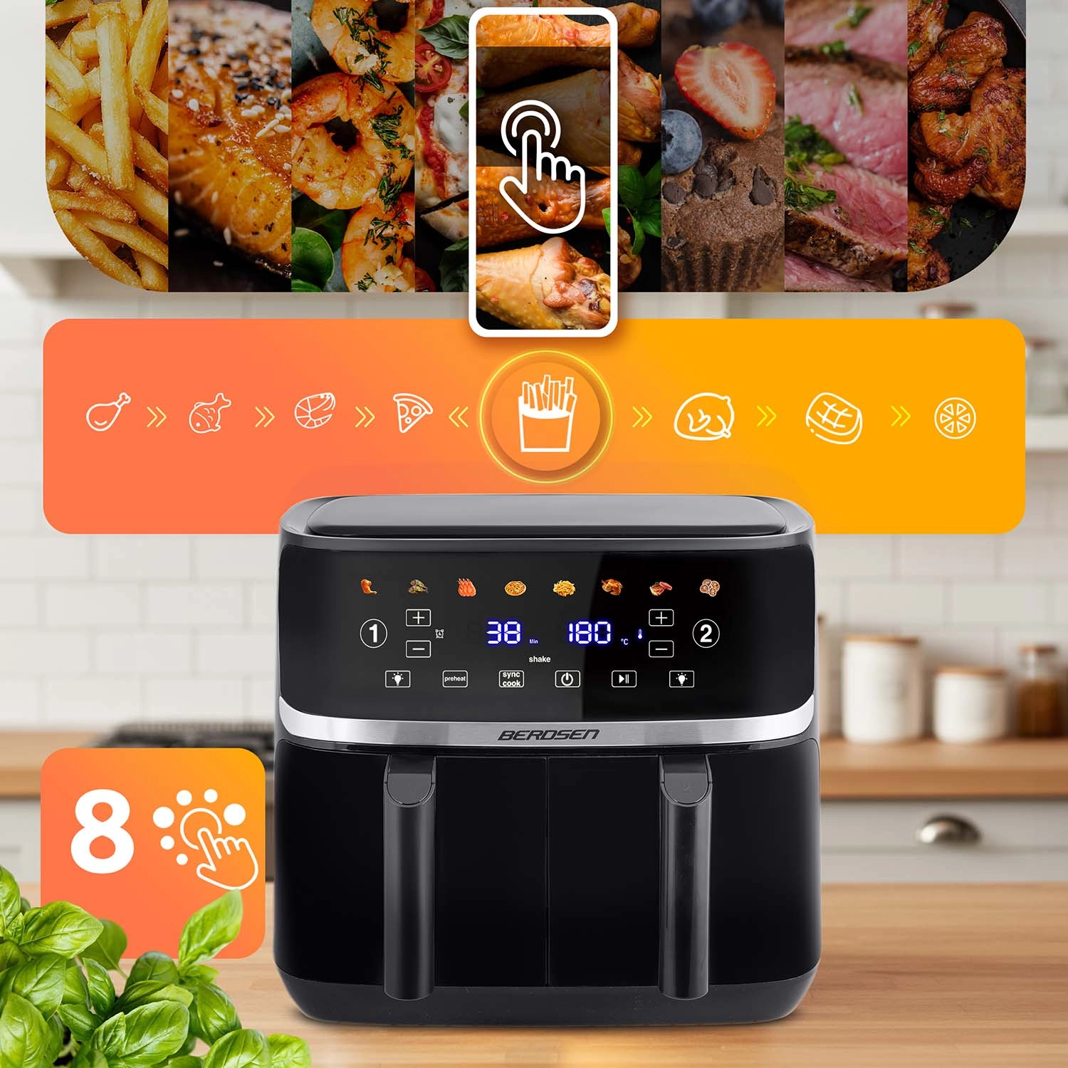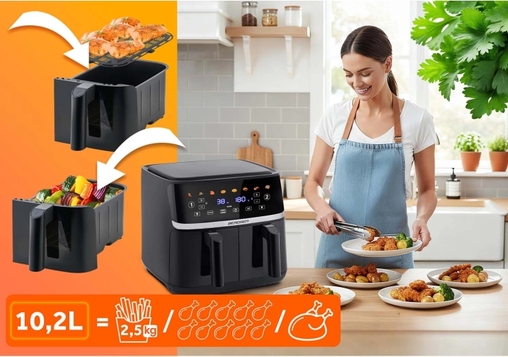 Découvrez une cuisson pratique et plus saine avec la friteuse à air chaud BERDSEN d’une capacité de 10,2 l et à double chambre (2 × 5,1 l). Grâce à sa puissance de 1700 W, à 8 programmes automatiques et à son panneau tactile, préparez des frites croustillantes, des viandes juteuses et des légumes avec jusqu’à 90 % de matières grasses en moins. Les fenêtres avec éclairage LED vous permettent de surveiller la cuisson sans ouvrir, et les fonctions de préchauffage, démarrage différé et rappel pour remuer/retourner rendent la cuisine encore plus simple.