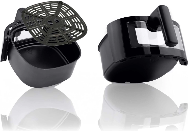 Le panier amovible et l’insert perforé avec revêtement antiadhésif PTFE assurent une circulation d’air homogène et un nettoyage simplifié – pièces compatibles lave-vaisselle.