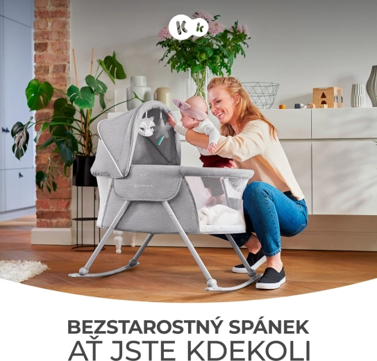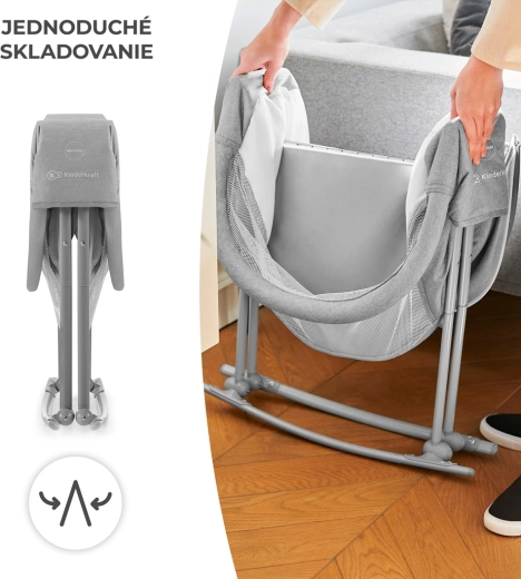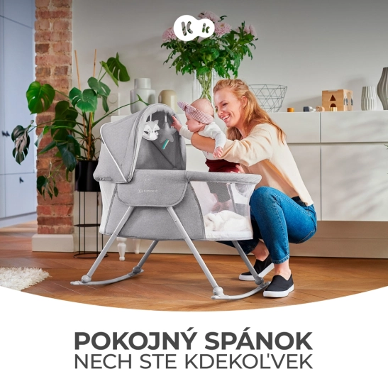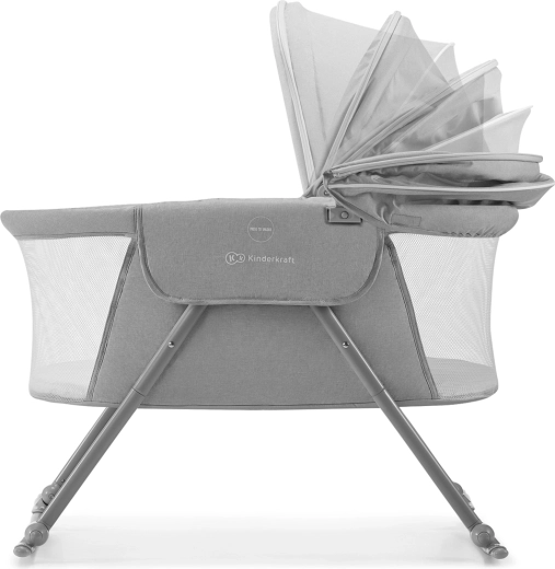 Le lit bébé pratique 3-en-1 KINDERKRAFT Lovi sert de lit, de berceau et de lit de voyage. Il est léger et compact, avec un pliage rapide sans outils, une fonction de balancement, une capote amovible avec moustiquaire intégrée et des côtés en maille respirante pour un sommeil sûr et confortable dès la naissance jusqu’à 9 kg.