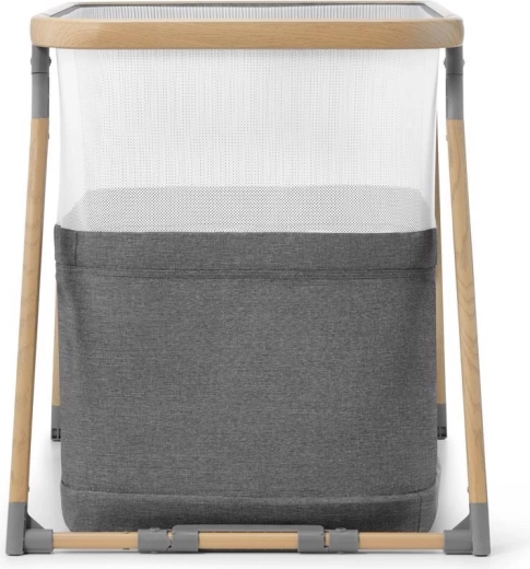 Les panneaux en maille favorisent la circulation de l’air et permettent un contact visuel avec l’enfant, tandis que le cadre en aluminium au décor bois garantit la stabilité.