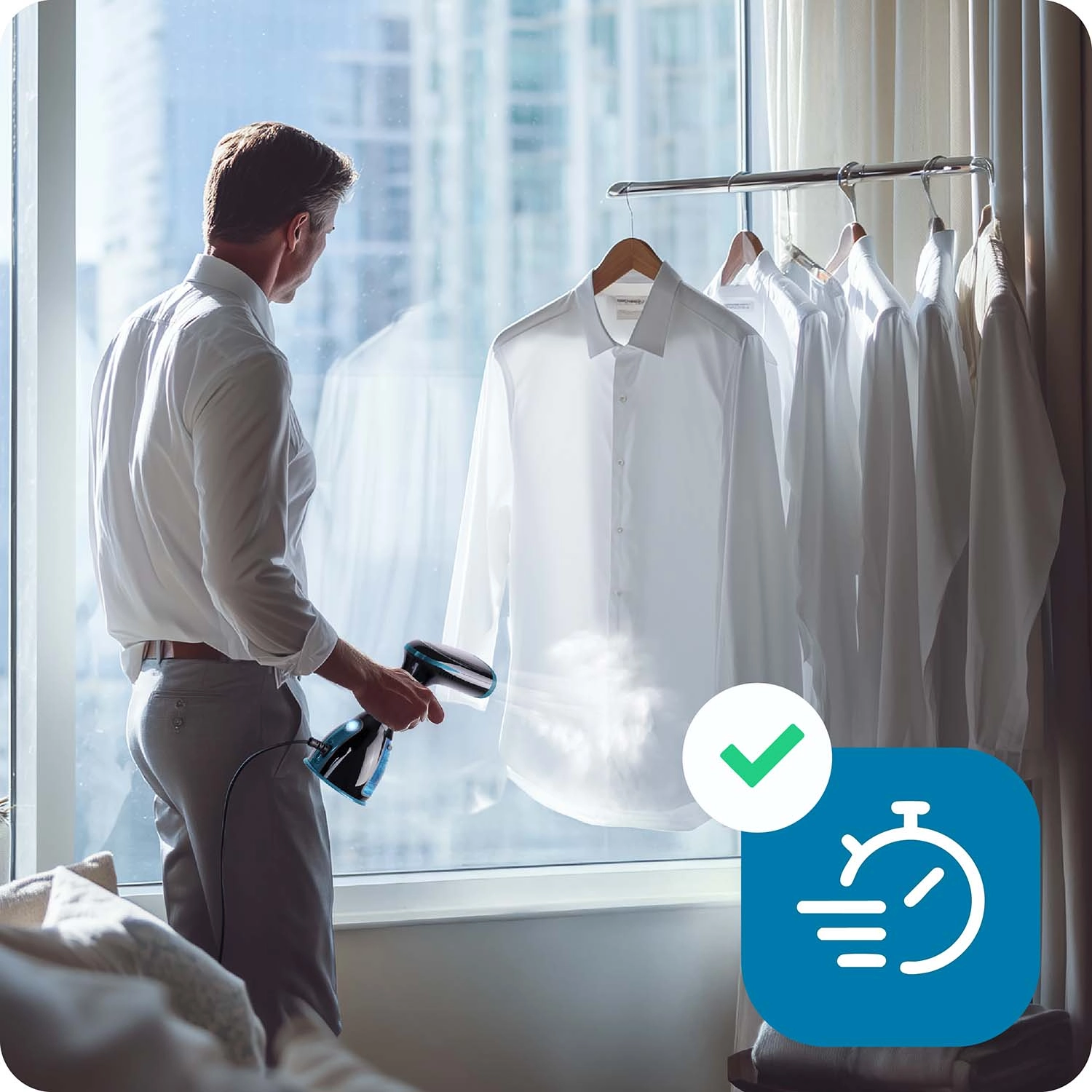 La vapeur haute température contribue à l’hygiène et au rafraîchissement des textiles, sans produits chimiques ni humidité superflue. Parfait à la maison comme en voyage : son corps compact tient même dans une petite valise. Avec l’embout brosse, vous pouvez à la fois défroisser et retirer peluches et fils des manteaux ou des tissus d’ameublement.