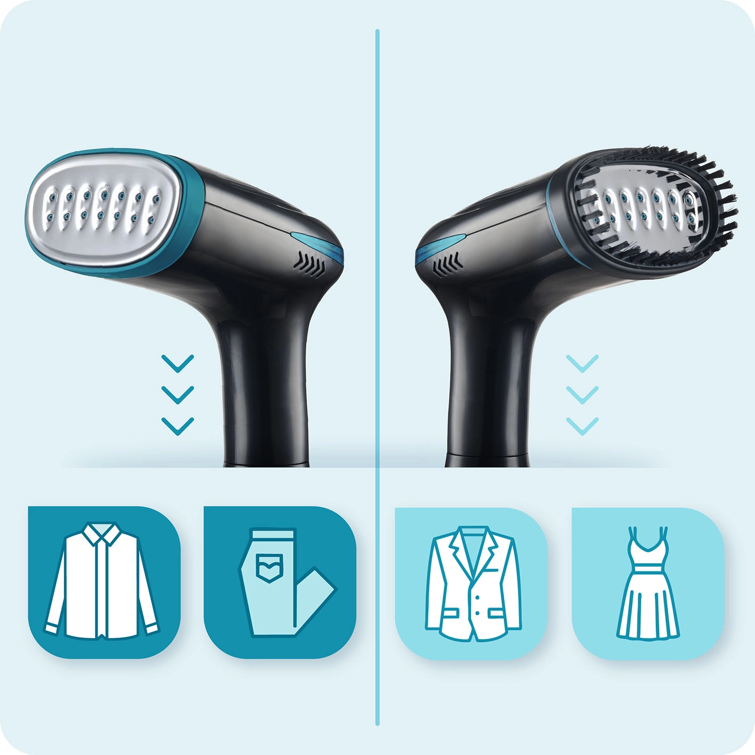 - Large éventail d’utilisations : sans embout pour les textiles lisses et résistants (chemises, pantalons, coton), avec embout brosse pour les matières délicates (maille, soie, robes fines).