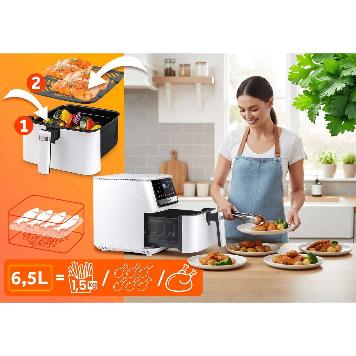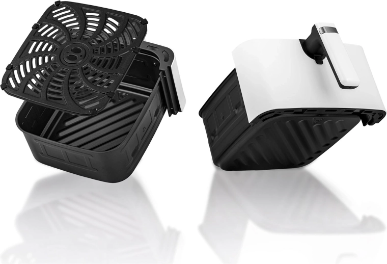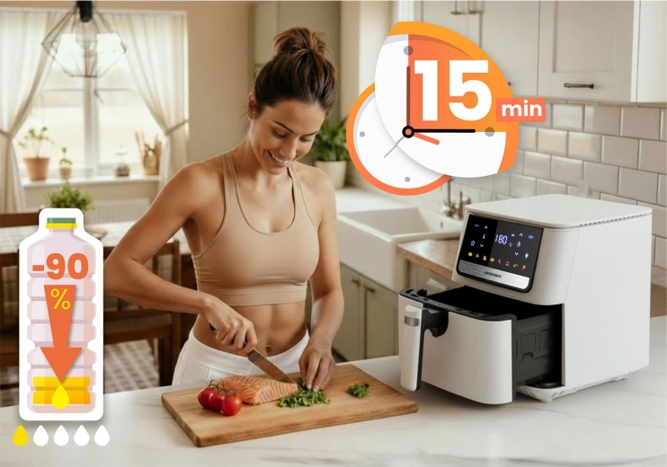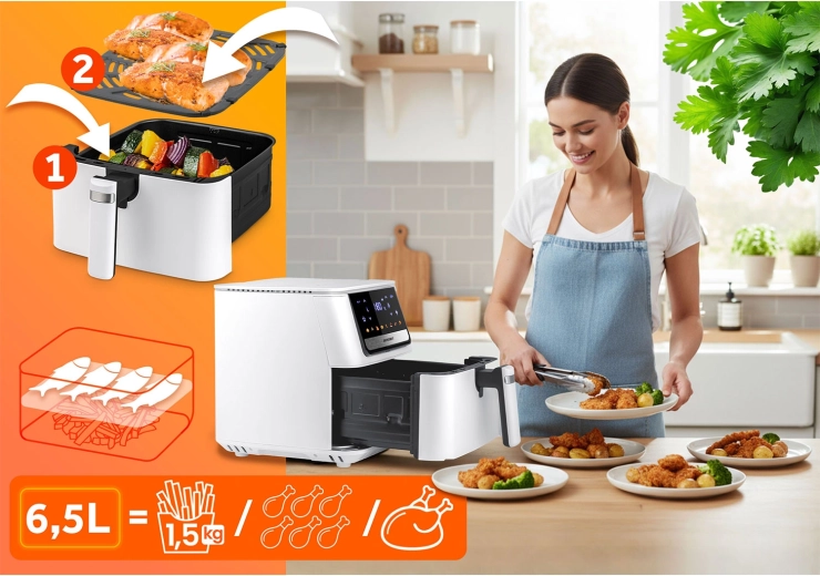 Le panneau tactile intuitif avec icônes en couleur et 8 programmes intelligents simplifie la préparation de vos plats préférés. Le grand panier de 6,5 l peut accueillir même une pizza surgelée entière ou un repas pour toute la famille. Le panier amovible et le plateau en acier inoxydable avec revêtement antiadhésif PTFE passent au lave-vaisselle – le nettoyage devient un jeu d’enfant.