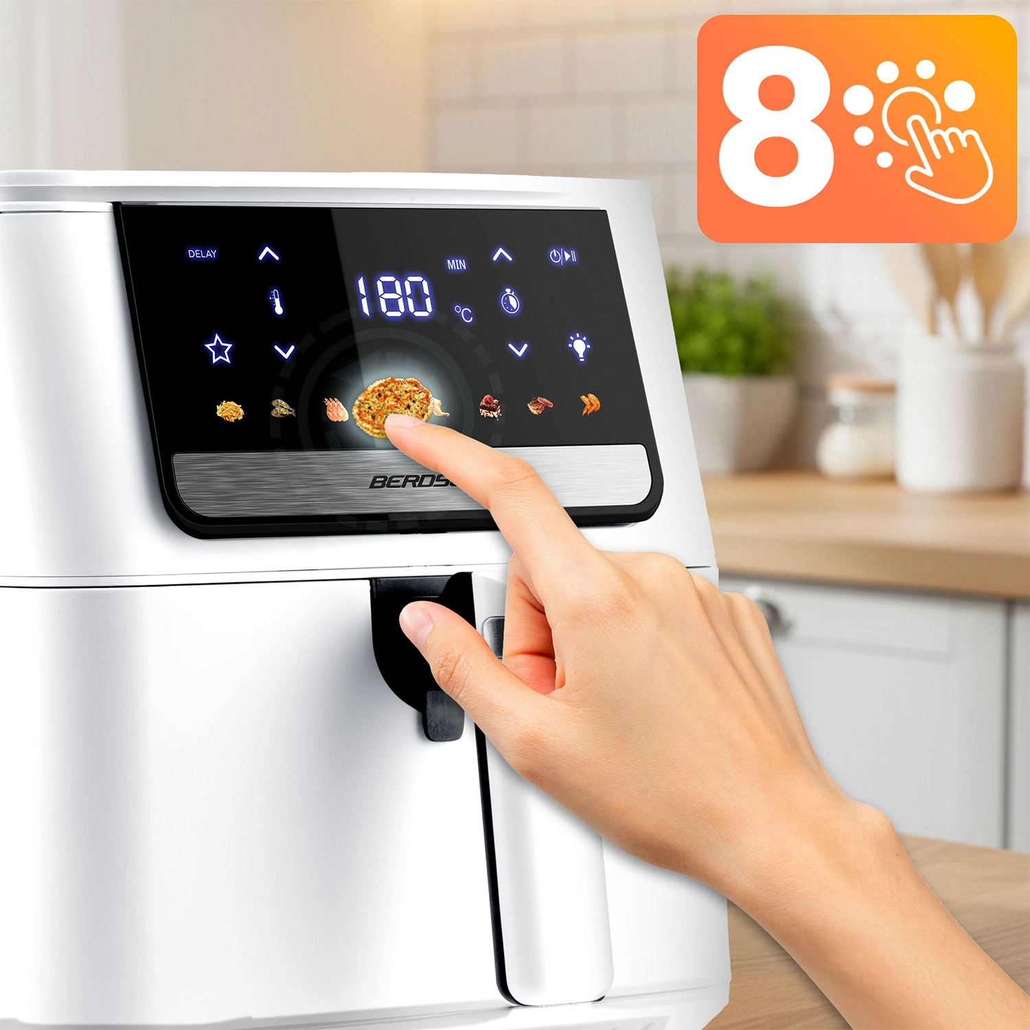 Cuisinez plus sain sans compromis sur le goût. La friteuse BERDSEN utilise une circulation d’air chaud moderne pour une cuisson homogène et rapide sans friture profonde. Température réglable jusqu’à 200 °C et minuteur jusqu’à 60 minutes pour un résultat parfait avec les frites, le poulet, le poisson, les légumes et les pâtisseries.