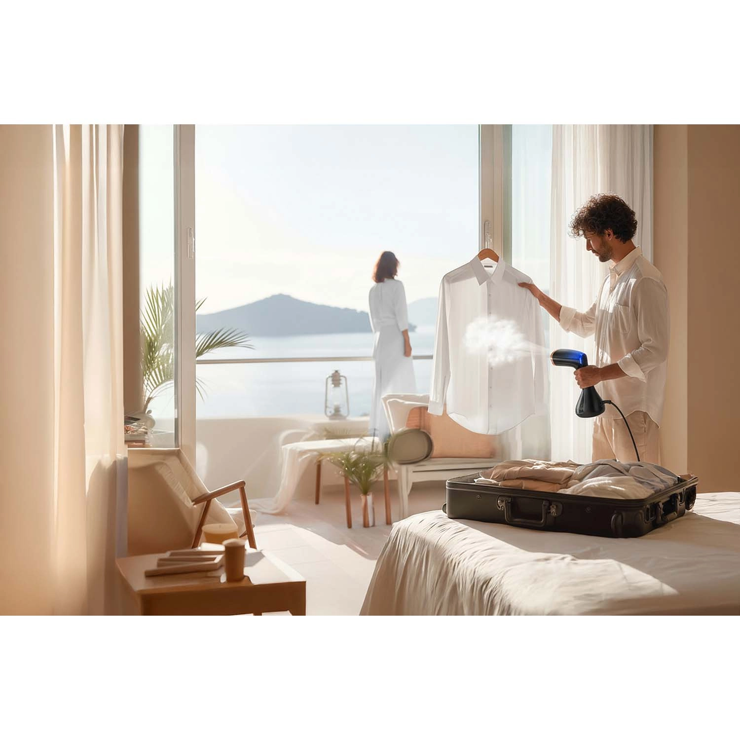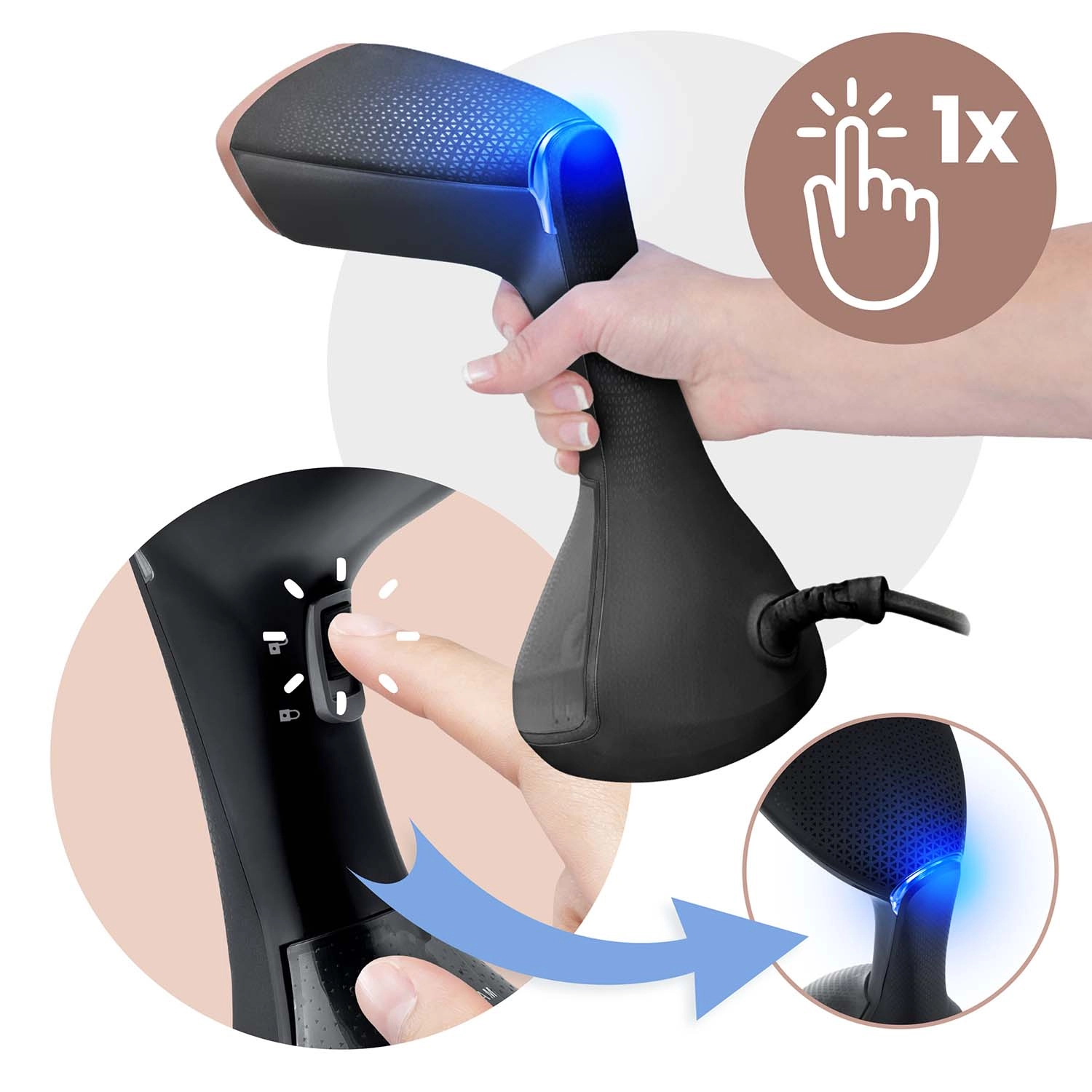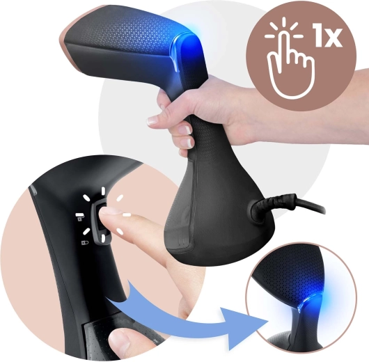 Un design bien pensé garantit un confort d’utilisation au quotidien comme en voyage. Le grand réservoir amovible de 230 ml avec flotteur permet un défroissage continu même à l’horizontale, et le long cordon de 2 m offre une grande liberté de mouvement. Un simple bouton suffit pour démarrer l’appareil et produire immédiatement de la vapeur. La boîte comprend une brosse pour défroisser et nettoyer les fibres simultanément, ainsi qu’un entonnoir de remplissage pratique.