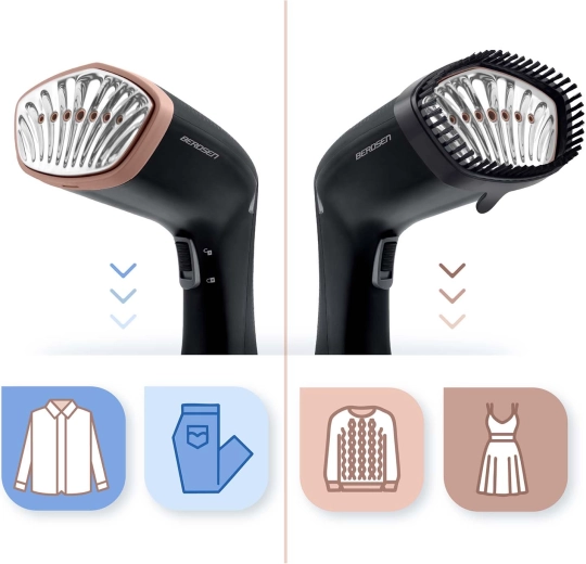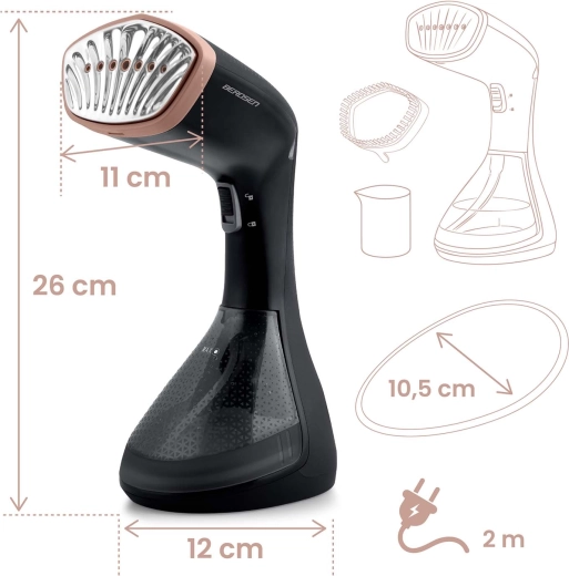 Défroisseur vapeur à main BERDSEN puissant et élégant avec une puissance de 1600 W et une forte émission de vapeur de 26 g/min, qui lisse rapidement les plis, rafraîchit les tissus et aide à éliminer les bactéries et les acariens sans produits chimiques. Il dispose d’un réservoir amovible de 230 ml, d’un contrôle simple par un seul bouton et est fourni avec une brosse ainsi qu’un entonnoir de remplissage pour un remplissage aisé de l’eau.