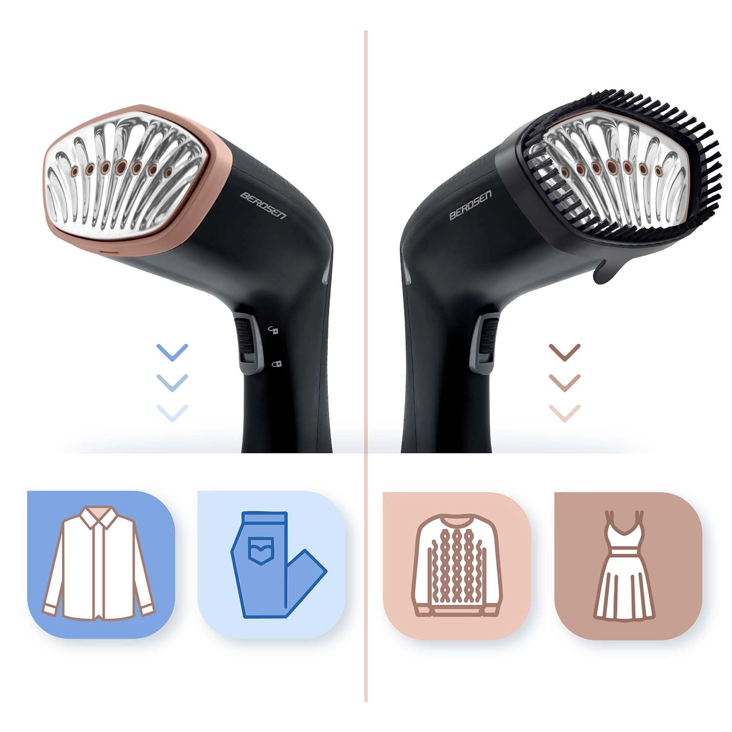 Fini les planches à repasser et les longues attentes. Le défroisseur vapeur à main BERDSEN lisse une chemise en 1 minute directement sur cintre. Le puissant débit de vapeur de 26 g/min vient à bout des plis tenaces tout en rafraîchissant délicatement les tissus. Grâce à la haute température, la vapeur réduit efficacement les bactéries et les acariens sur les vêtements, les tissus d’ameublement et les accessoires textiles – sans recourir à des produits chimiques.