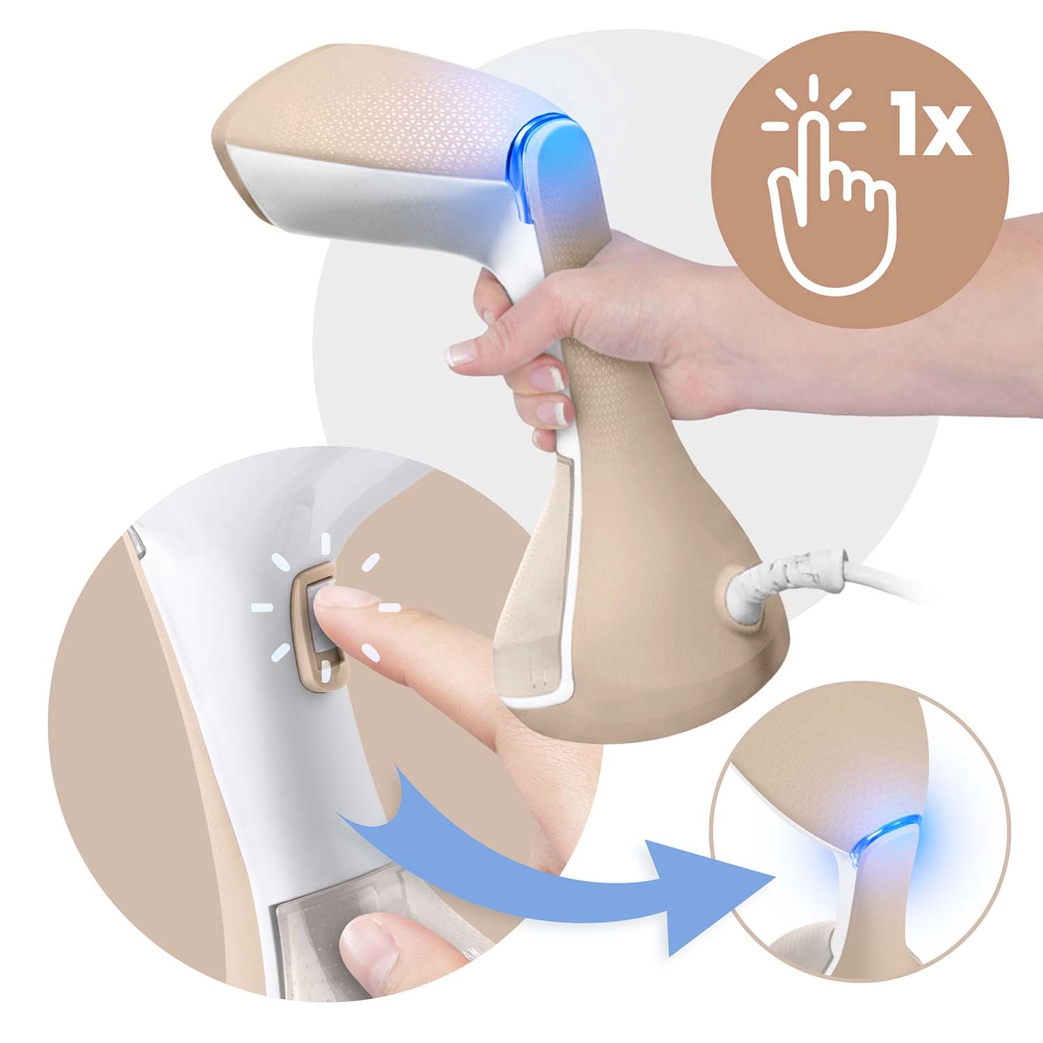 La vapeur chaude élimine efficacement les bactéries et les acariens des textiles, rideaux et tissus d’ameublement – et cela sans utiliser de produits chimiques. La boîte contient une brosse accessoire pour défroisser et nettoyer simultanément les fibres (manteaux, tissus d’ameublement) ainsi qu’un entonnoir de remplissage pour un ajout d’eau facile. La commande est intuitive – un seul bouton avec verrouillage pour une sortie de vapeur continue.