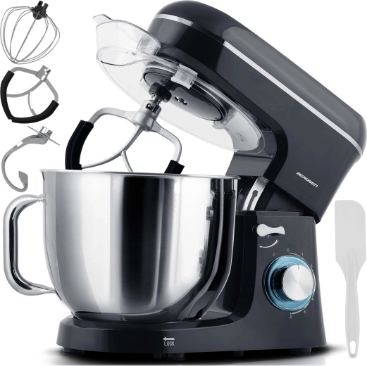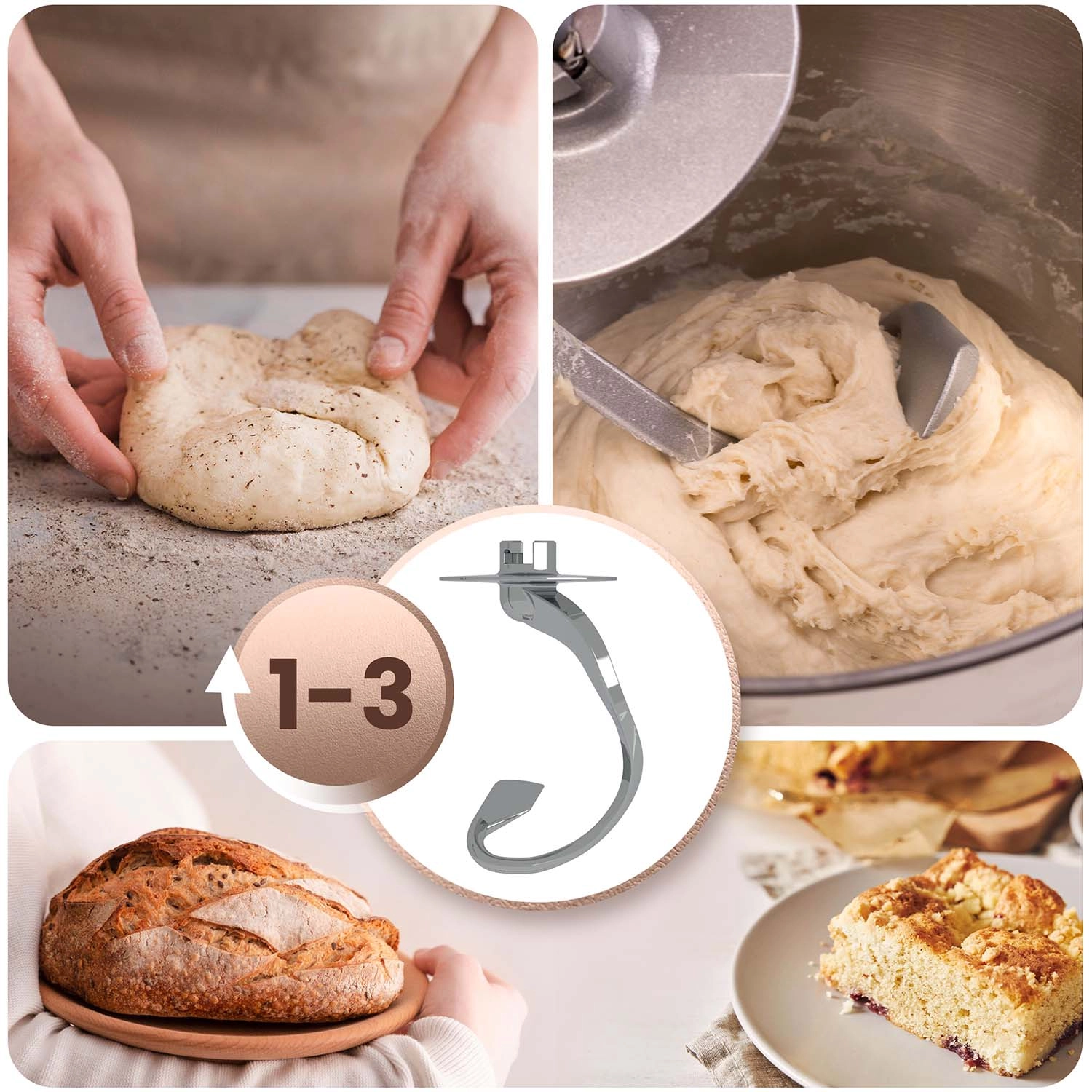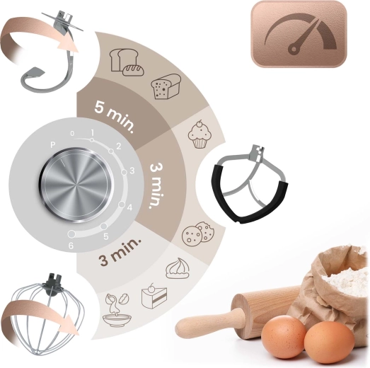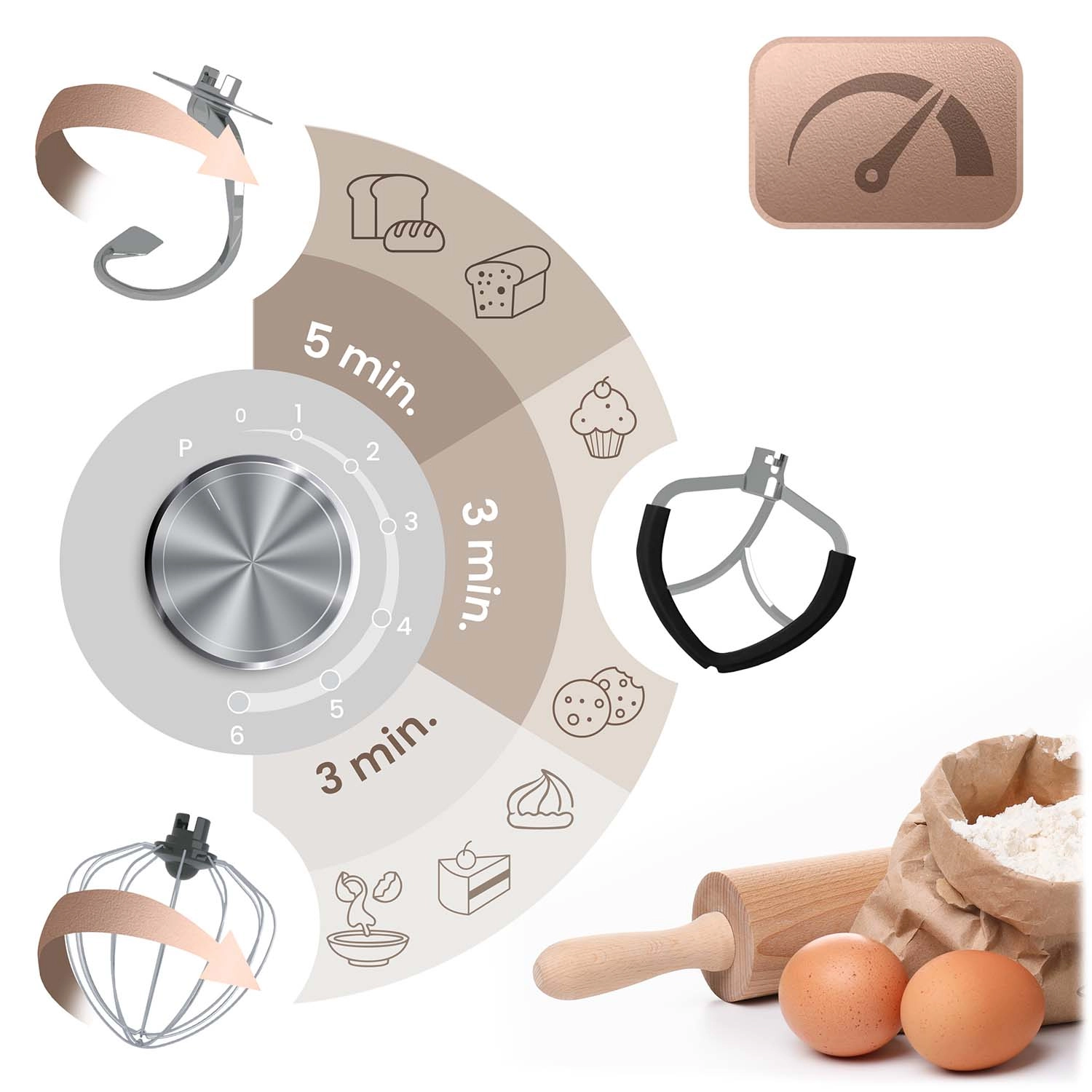 - 3 accessoires inclus : crochet pétrin (vit. 1–3), batteur plat (2–4), fouet (5–6) pour des textures parfaites, des pâtes levées aux crèmes aériennes.