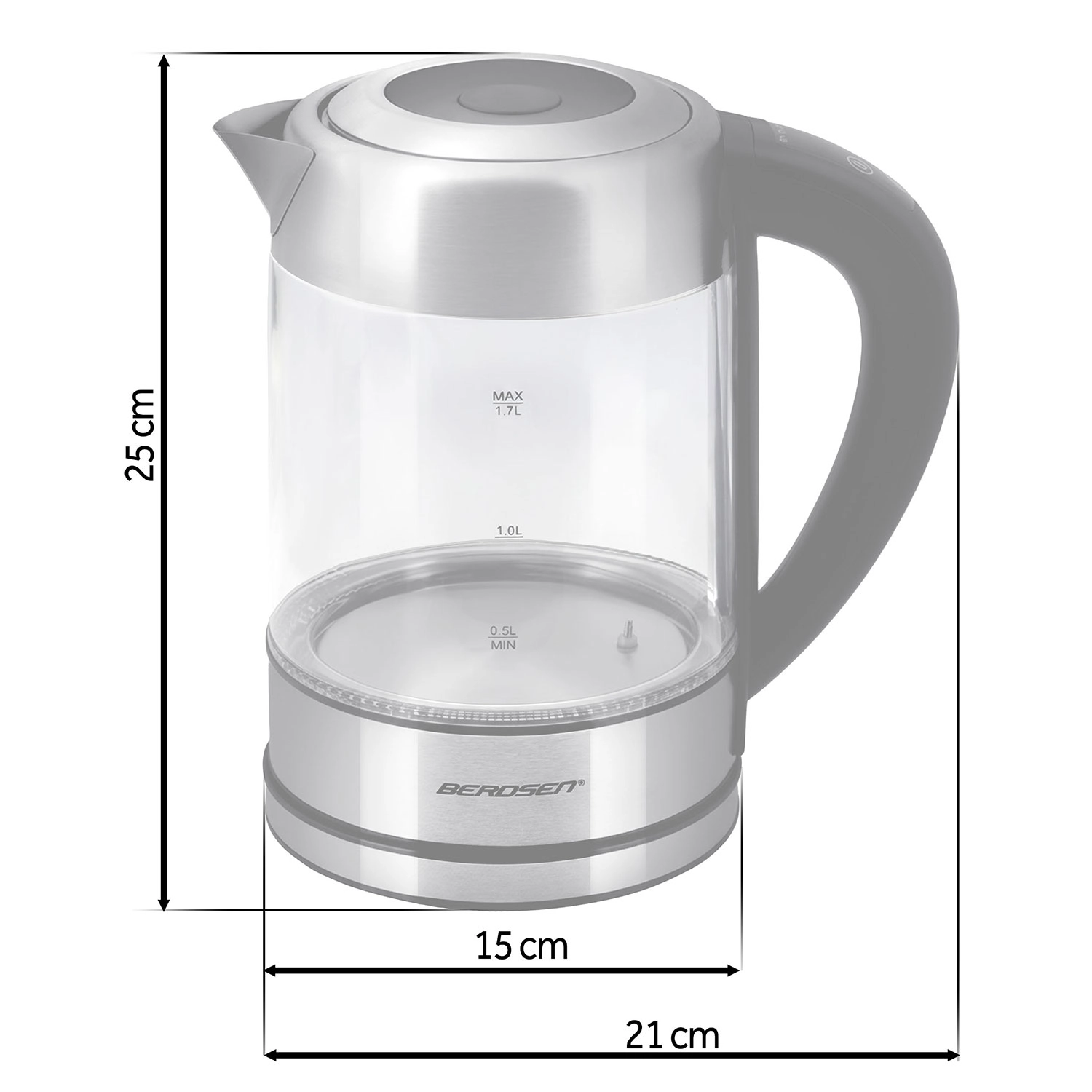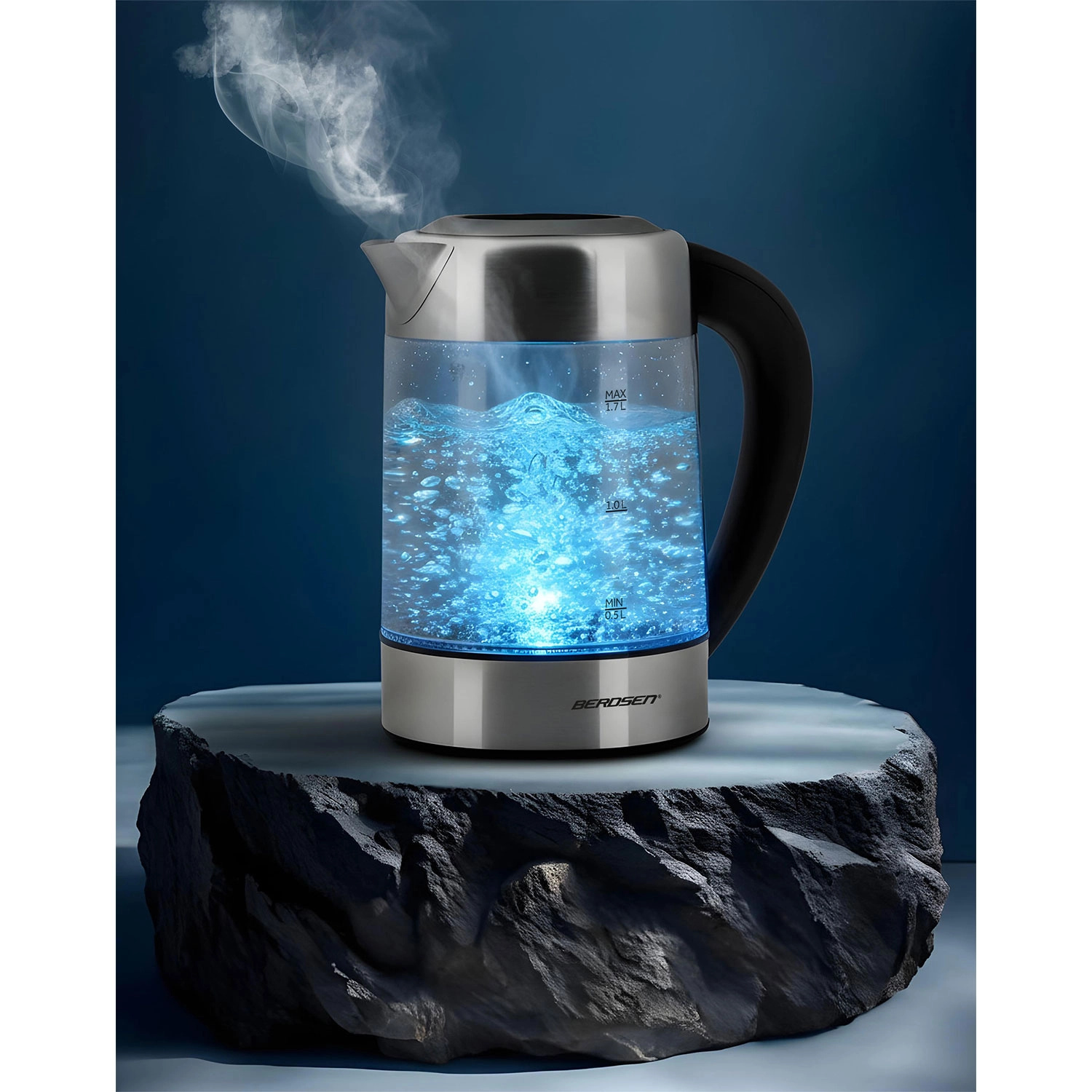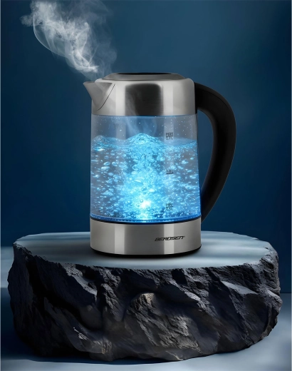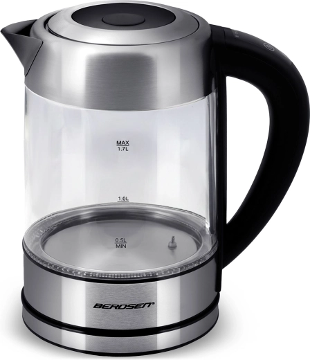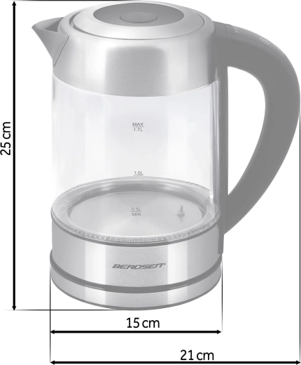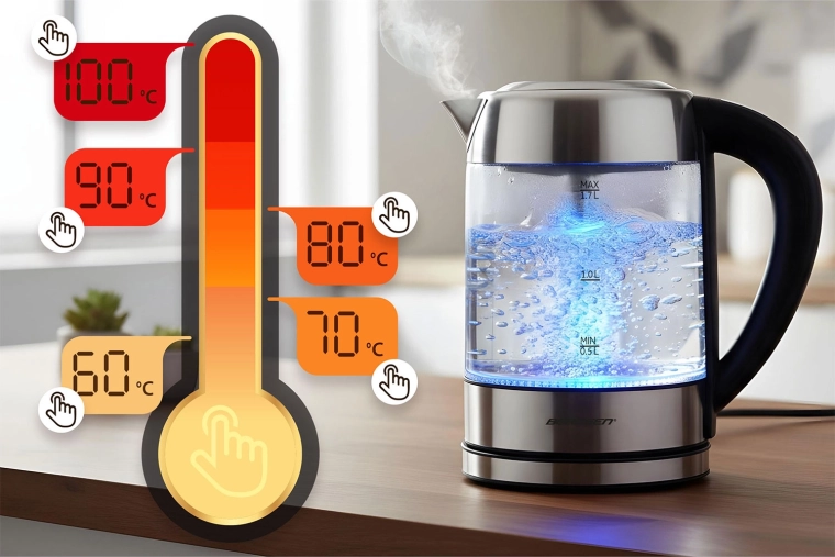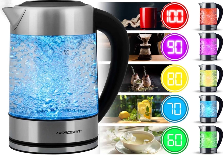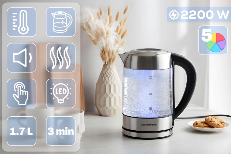 Découvrez la bouilloire en verre moderne BERDSEN d’une capacité de 1,7 l et d’une puissance de 2200 W pour chauffer l’eau rapidement et avec précision. Grâce au contrôle tactile, à la mesure intelligente de la température en temps réel et au réglage de 60 à 100 °C, préparez thé, café et boissons pour enfants exactement comme il faut. Le rétroéclairage LED indique la phase de chauffage, le verre borosilicate garantit une saveur pure et une grande résistance, et la fonction de sécurité anti-marche à sec assure une utilisation sereine.