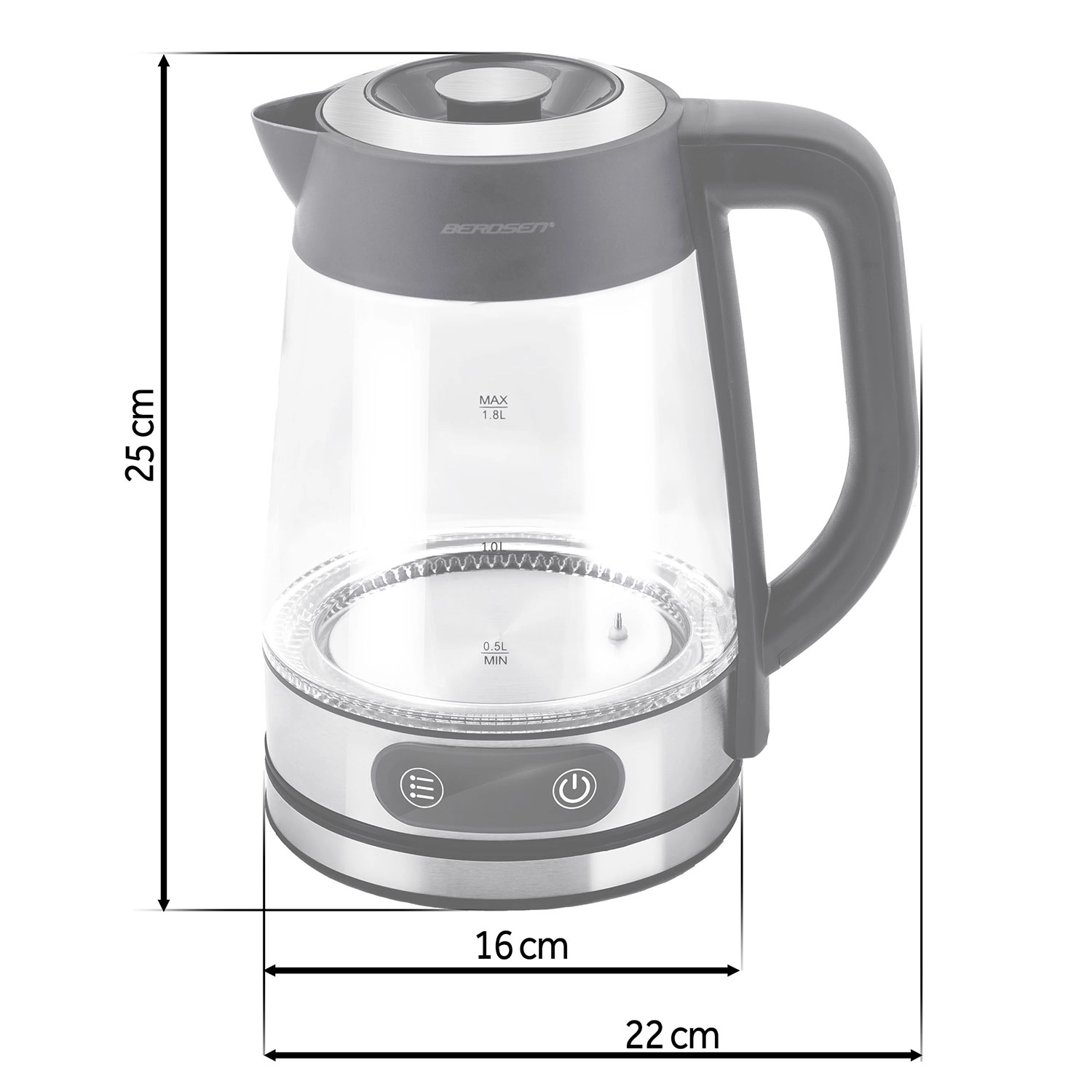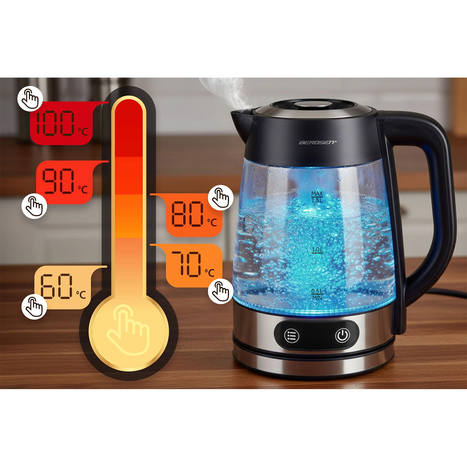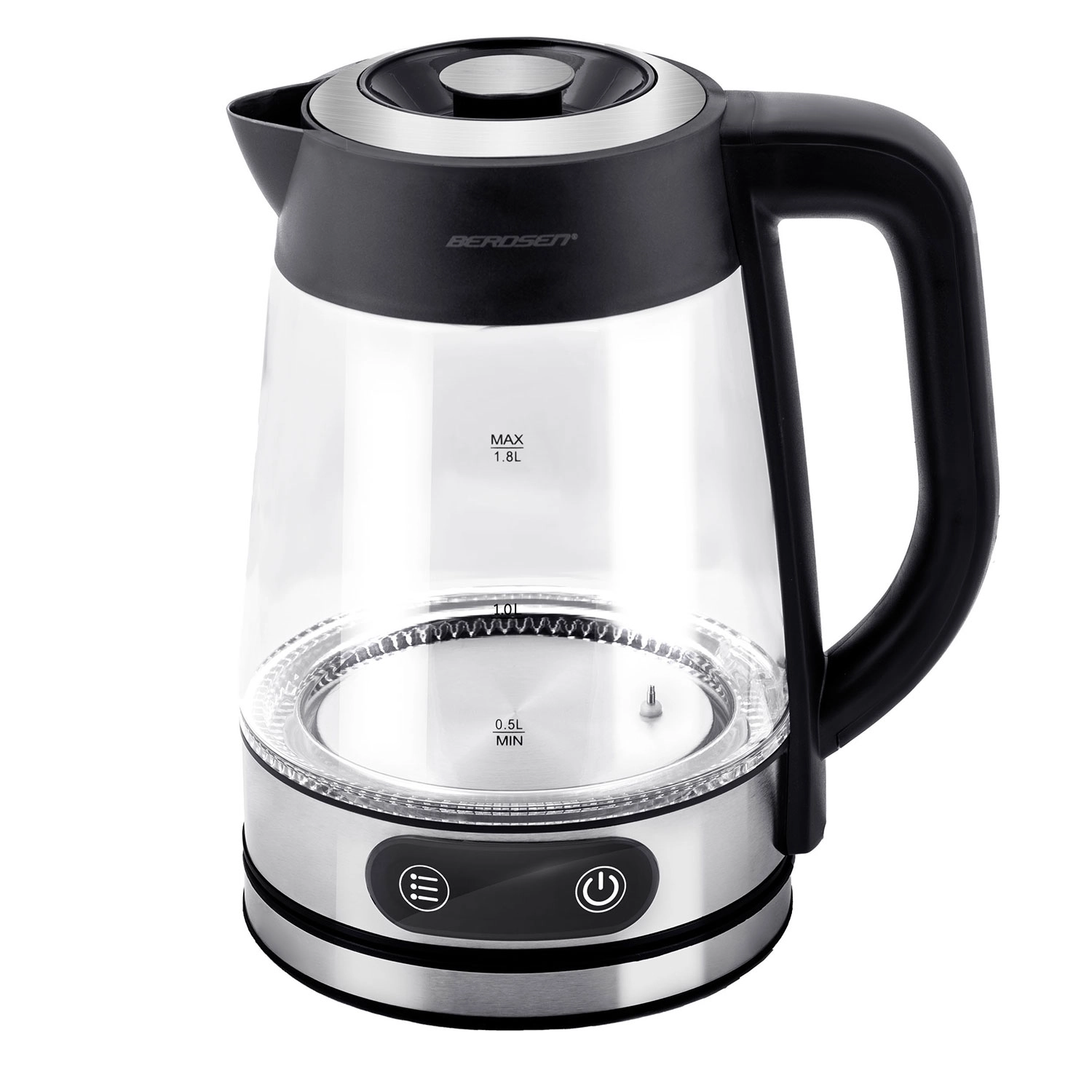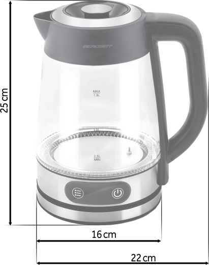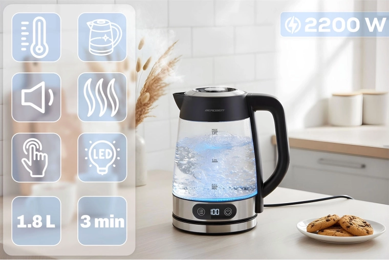Élégante bouilloire en verre BERDSEN d’une capacité de 1,8 l et d’une puissance de 2200 W, offrant un chauffage précis de l’eau avec réglage de la température de 40 à 100 °C. Grâce au panneau tactile, à l’affichage numérique et au rétroéclairage LED, l’utilisation est d’un confort maximal. Le verre borosilicaté résistant garantit longévité et pureté de l’eau, la fonction Keep Warm maintient la température, et la protection contre la marche à vide assure une sécurité au quotidien.