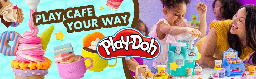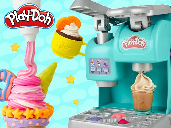 Le set Play-Doh Café coloré transforme la chambre en une petite cafétéria pleine de fantaisie. Les enfants peuvent préparer des « cafés », thés, frappés ou milk-shakes en pâte à modeler, les décorer de chantilly et les présenter sur un présentoir transparent. Grâce aux nombreux accessoires et aux moules pour biscuits, muffins et donuts, l’amusement est garanti encore et encore.
