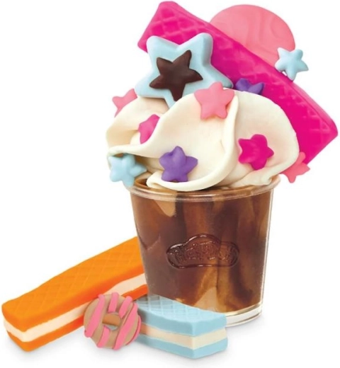 Avec une simple pression sur le levier, remplissez un gobelet de « glace molle » ou d’une boisson colorée et décorez-le avec des nappages et des formes moulées. Idéal pour jouer au barista et stimuler l’imagination.