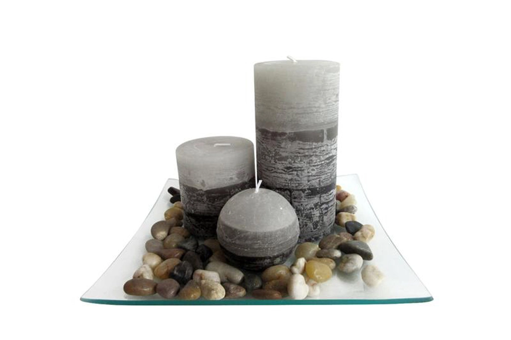 - Décoration complète – bougies, plateau en verre et pierres forment un arrangement prêt à poser.