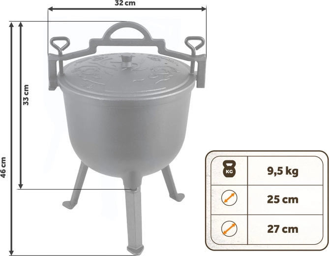 Le grand volume de 8 l rassasie famille et amis. Idéal l’été au grill comme l’hiver au feu – pour goulasch, rôtis et soupes consistantes.