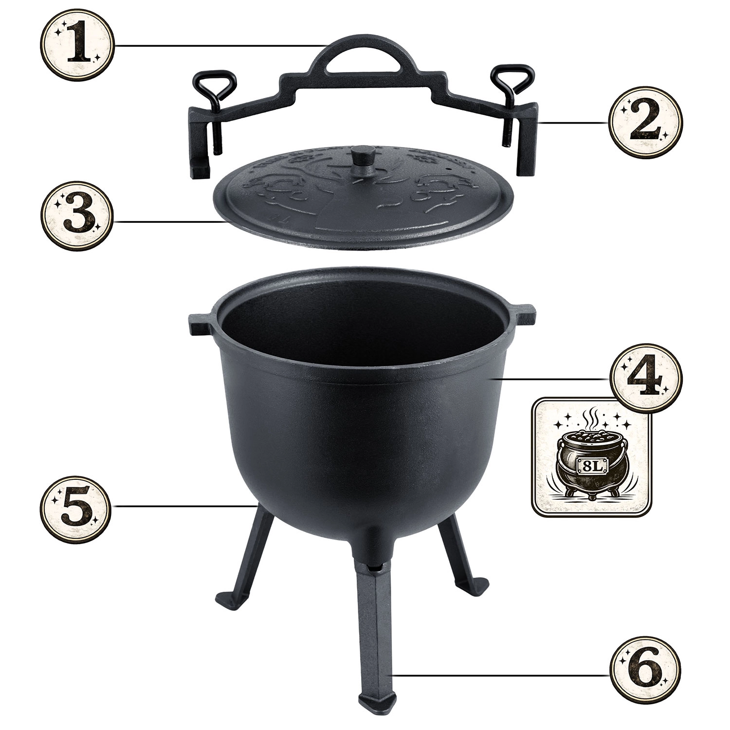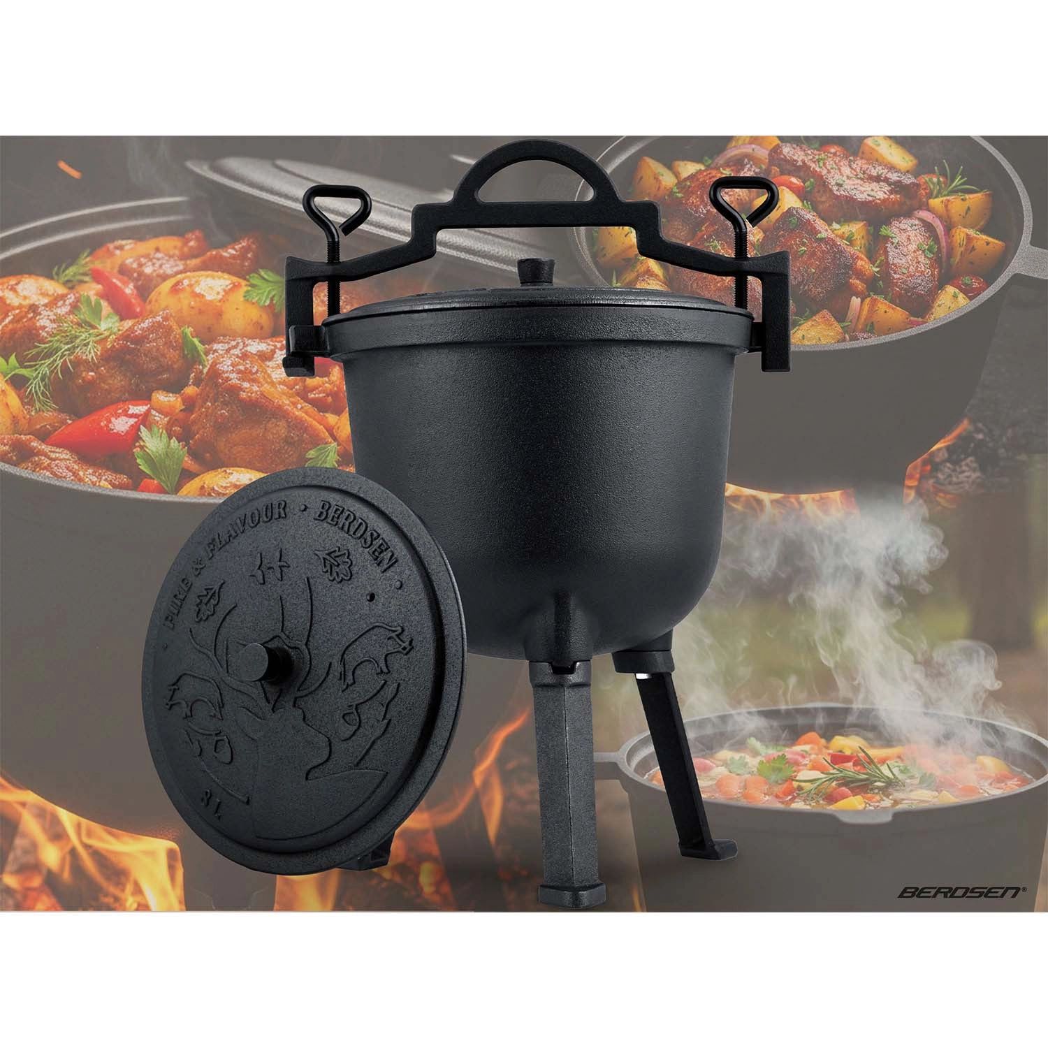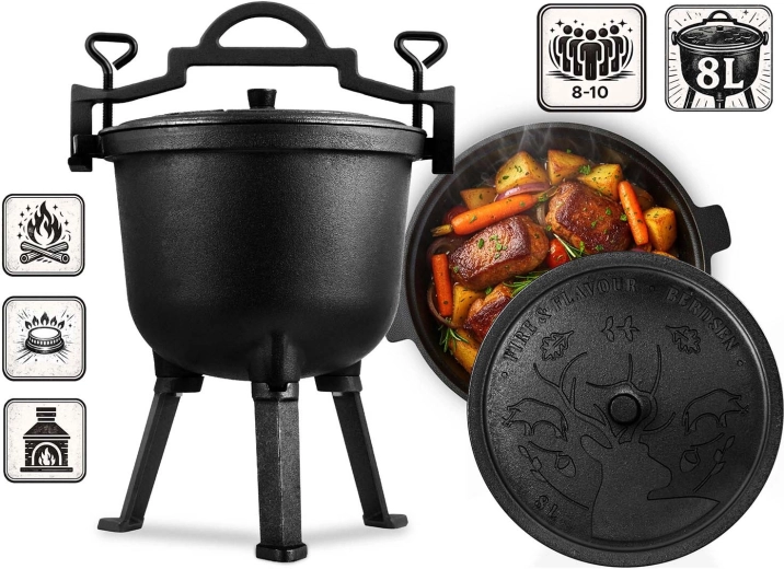 La conception offre une polyvalence maximale : posez le chaudron sur un trépied vissé aux patins stables, suspendez-le par sa anse robuste au-dessus de la flamme ou utilisez-le sans pieds sur une cuisinière à gaz. Le couvercle lourd avec évent retient vapeur et arômes pour garder tous les sucs.