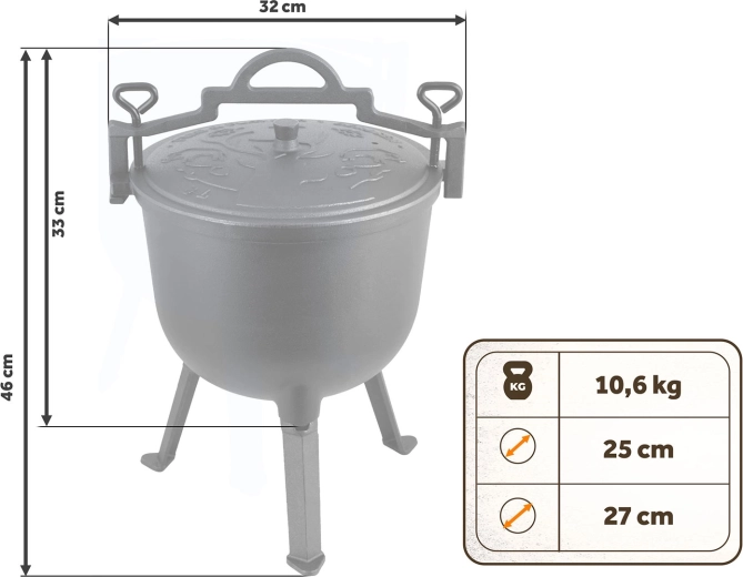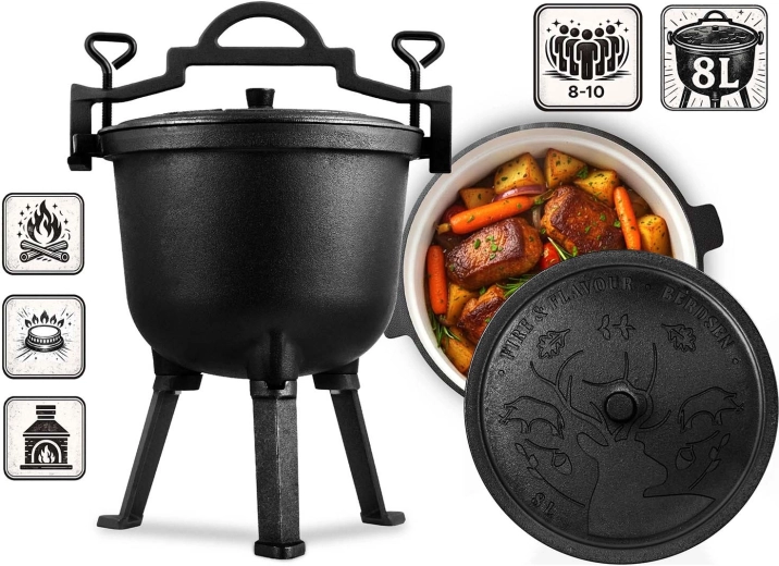 Grâce à sa conception universelle, vous pouvez le poser sur un trépied stable, le suspendre au-dessus du feu par une anse robuste ou, après avoir dévissé les pieds, l’utiliser sur une plaque à gaz. L’émail intérieur facilite le nettoyage et protège les ingrédients du contact direct avec la fonte. Le couvercle lourd avec orifice d’évent retient la vapeur et les arômes à l’intérieur pour un résultat juteux.