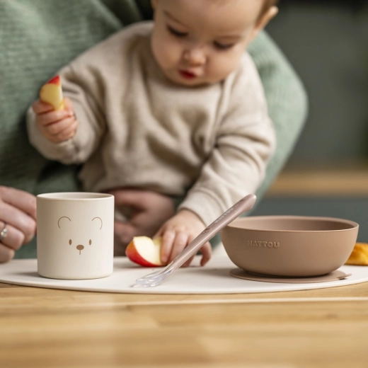 Ce set de repas en silicone Nattou est conçu pour accompagner les premières étapes de l’enfant vers l’autonomie à table. Le silicone souple et résistant est agréable au toucher, sûr pour les gencives des enfants et supporte un usage quotidien sans se fissurer ni se casser. La teinte neutre natural s’accorde facilement avec un intérieur moderne.