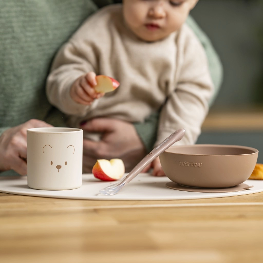 Un set de repas pratique et stylé pour les tout-petits comprenant une assiette, un bol, une tasse et une cuillère en silicone souple pour des repas sûrs et confortables. Base avec ventouse sur l’assiette et le bol pour une stabilité sans renversement, tandis que la cuillère ergonomique tient bien dans les petites mains. L’ensemble est résistant, incassable, compatible lave-vaisselle et micro-ondes (sauf la cuillère) – idéal pour l’alimentation et l’apprentissage de l’autonomie.