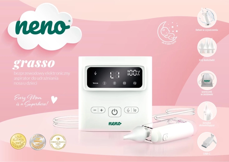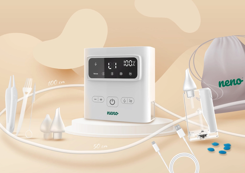 Grâce au fonctionnement sans fil, à la recharge USB‑C et à ses dimensions compactes, Neno Grasso est également idéal en voyage. L’emballage comprend un ensemble d’accessoires complet, dont un étui de protection, des tuyaux, des filtres et des outils de nettoyage – tout ce dont vous avez besoin pour une utilisation sûre et confortable de la naissance jusqu’à 6 ans.