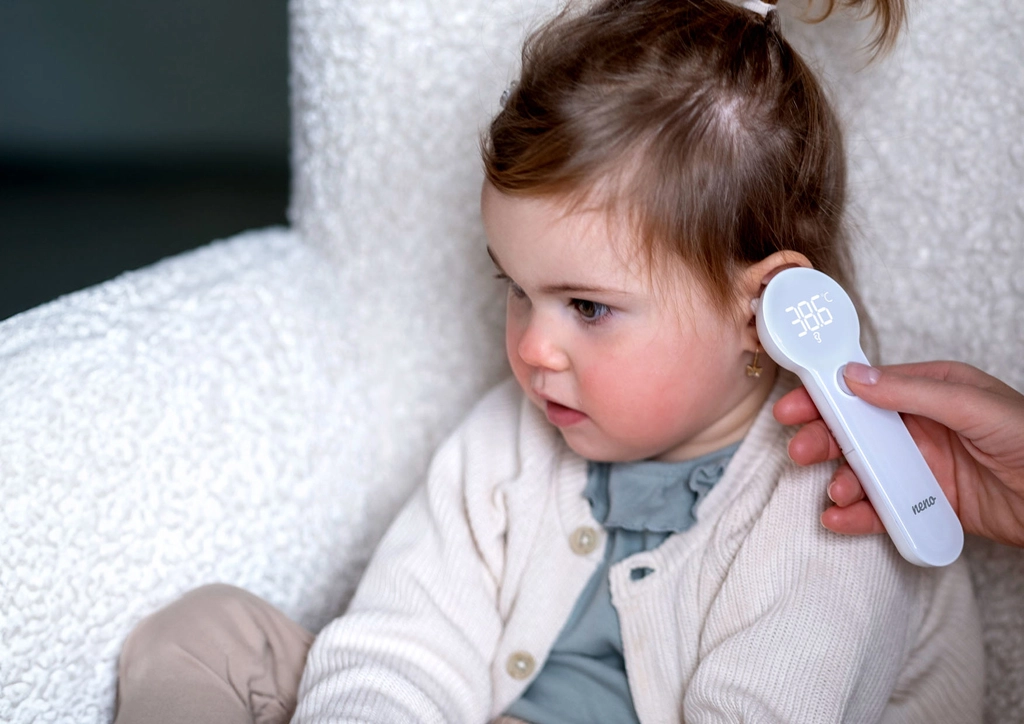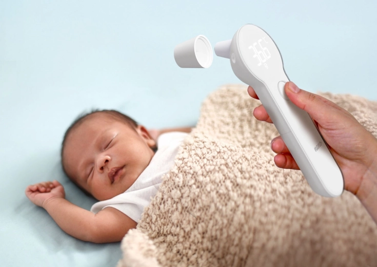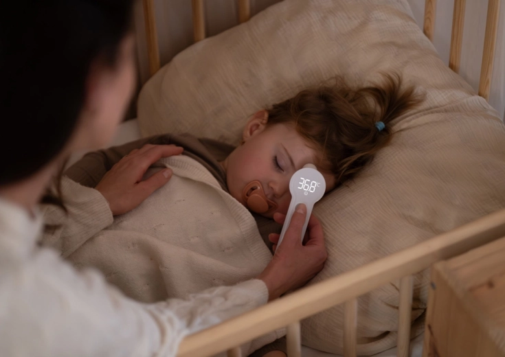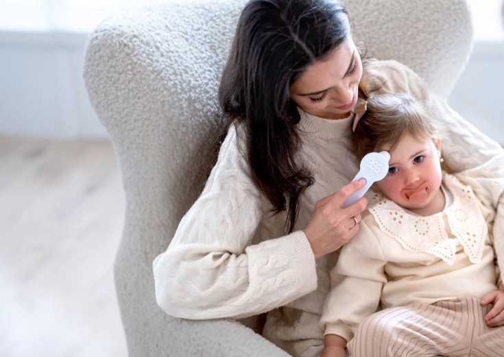 De grands chiffres lumineux se lisent facilement même dans l’obscurité. La mesure douce et sans contact ne réveille pas un enfant endormi.