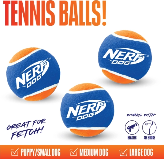 Profitez de séances de rapport plus longues et plus silencieuses avec le lot de trois balles de tennis NERF DOG dans un tube pressurisé pratique. Les balles avec fonction non‑squeak (sans sifflet) sont fabriquées en caoutchouc résistant avec un revêtement type tennis, offrent un excellent rebond et, grâce à leurs couleurs contrastées (bleu/orange), restent bien visibles même en mouvement.