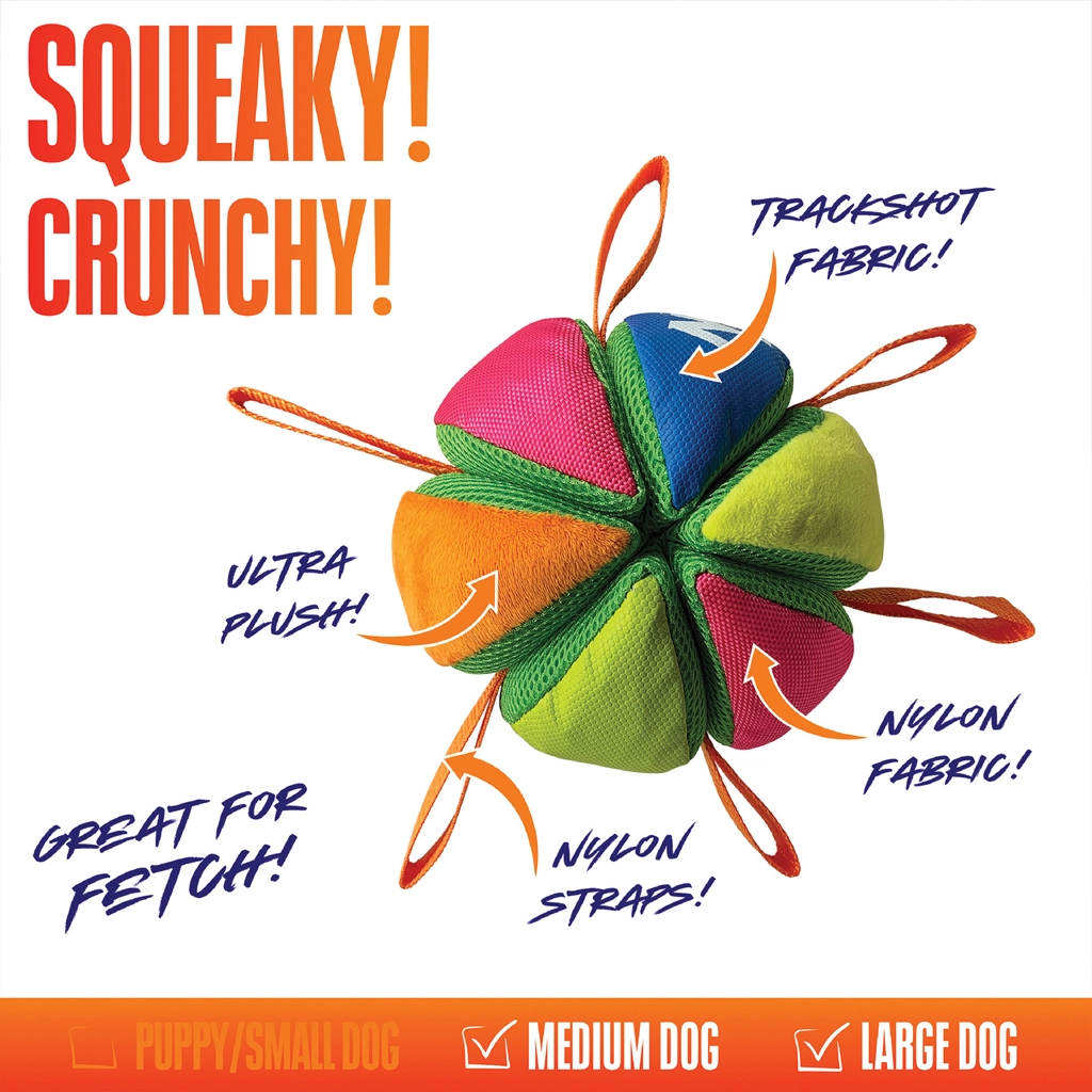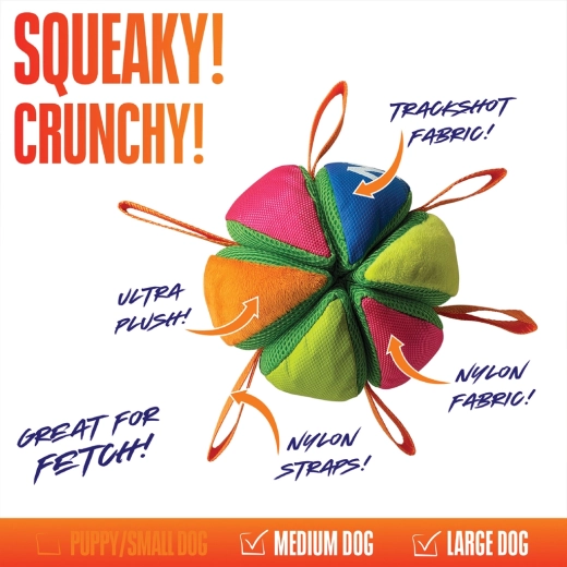 Balle multicolore NERF DOG avec couineur, rembourrage bruissant et poignées en nylon, idéale pour le rapport et le tir à la corde. Offre une construction robuste, une prise en main facile sous tous les angles et la possibilité de cacher des friandises pour un jeu interactif encore plus amusant.