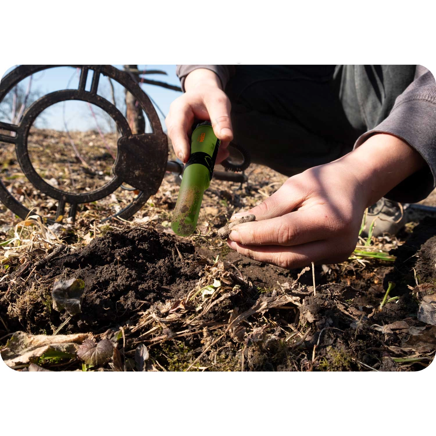 Grâce à son étanchéité IPX8, le pinpointer est adapté au travail sous la pluie, dans la boue et dans l’eau. Le réglage automatique fait gagner du temps à chaque mise sous tension et la mémoire des réglages retient le dernier mode utilisé. La construction légère en ABS résistant et la poignée antidérapante caoutchoutée assurent une prise sûre même avec des gants.