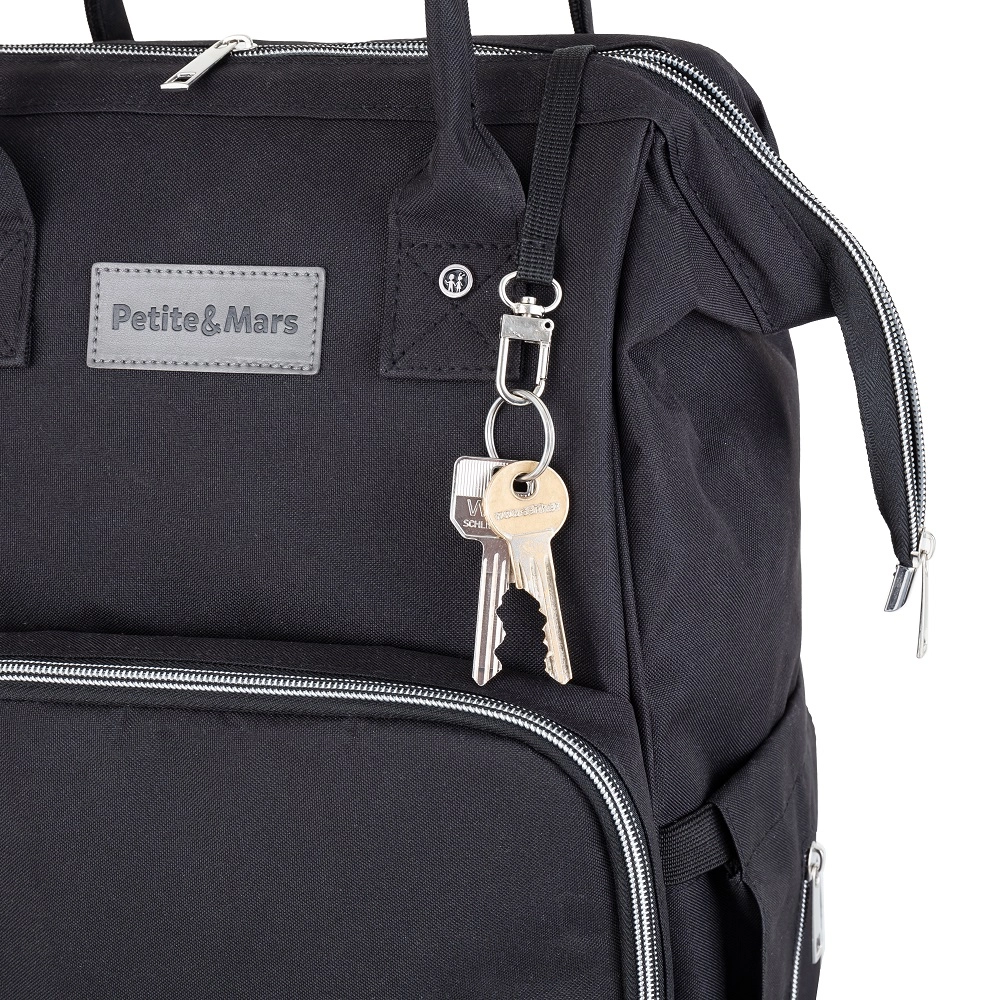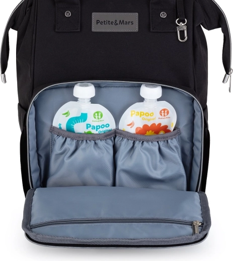 La disposition bien pensée propose 11 poches facilement accessibles, dont 2 poches isothermes pour maintenir la température des biberons, une poche étanche pour les vêtements mouillés ou les lingettes, une poche extérieure pour bouteille et une poche extérieure pour lingettes humides. On retrouve aussi une lanière porte-clés, un accès zippé à l’arrière pour un accès rapide et une sangle pour glisser sur la poignée de valise en voyage.