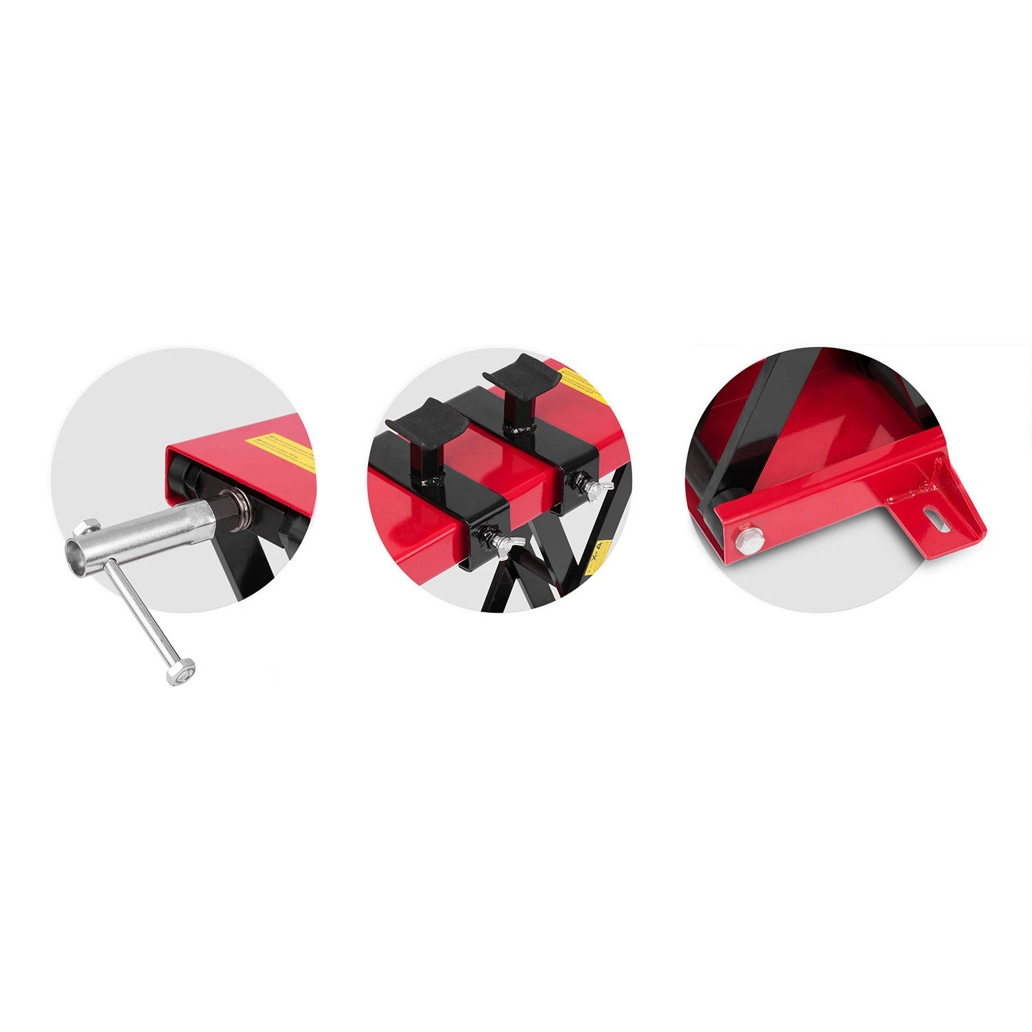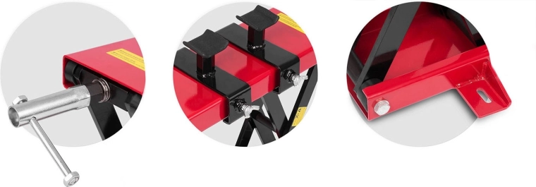 La structure en acier robuste soulève la plupart des motos et ATV. La base stable et les patins en caoutchouc protègent le cadre et garantissent un contact ferme.