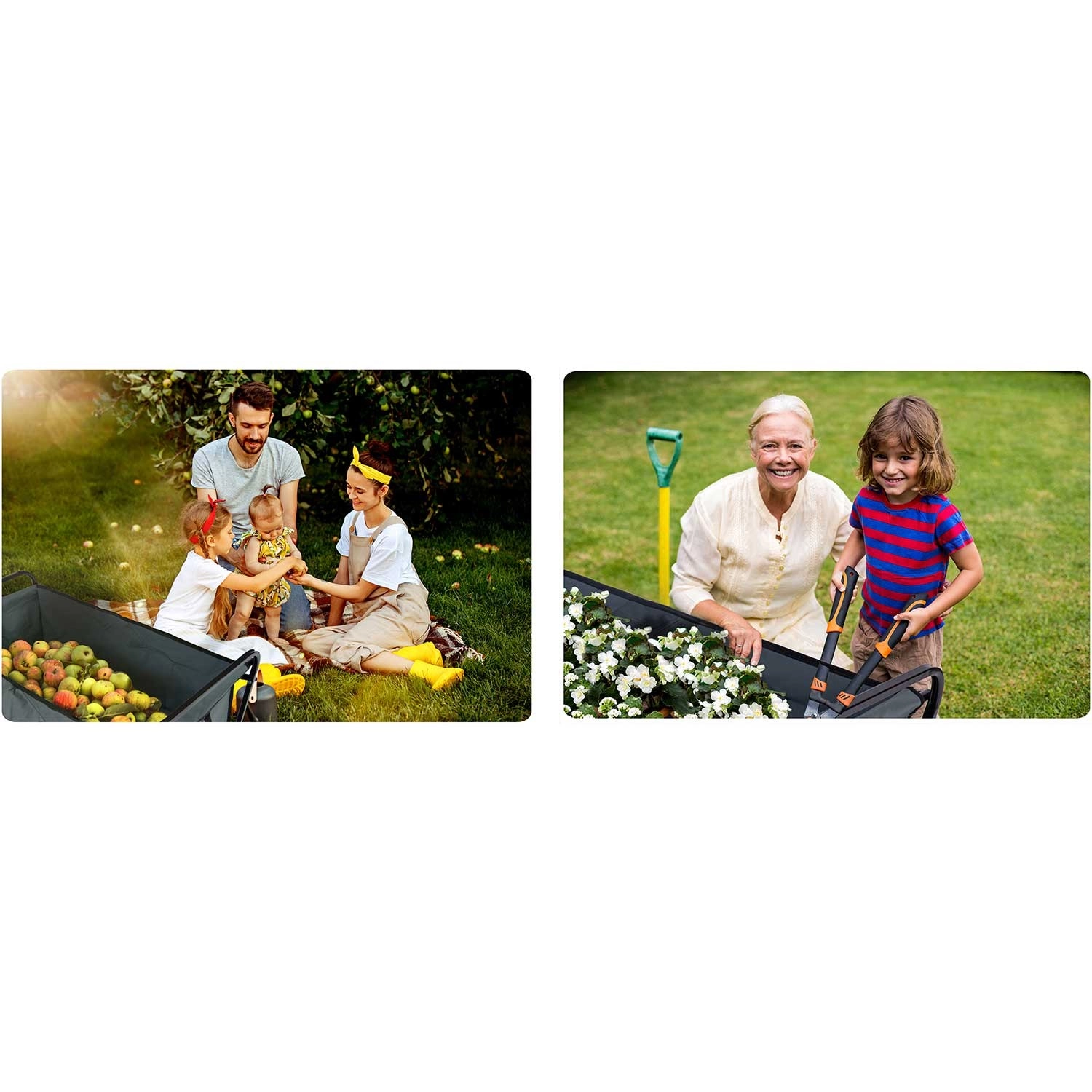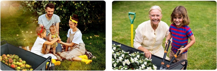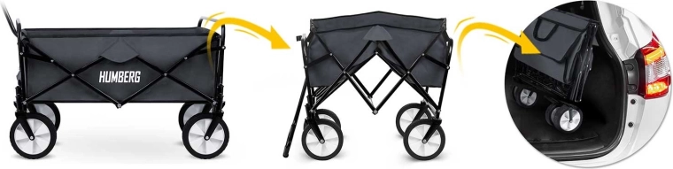 Le chariot se plie en quelques secondes à un format compact. Il tient dans le coffre de la voiture ou un petit débarras, idéal pour les voyages, pique-niques et vacances.