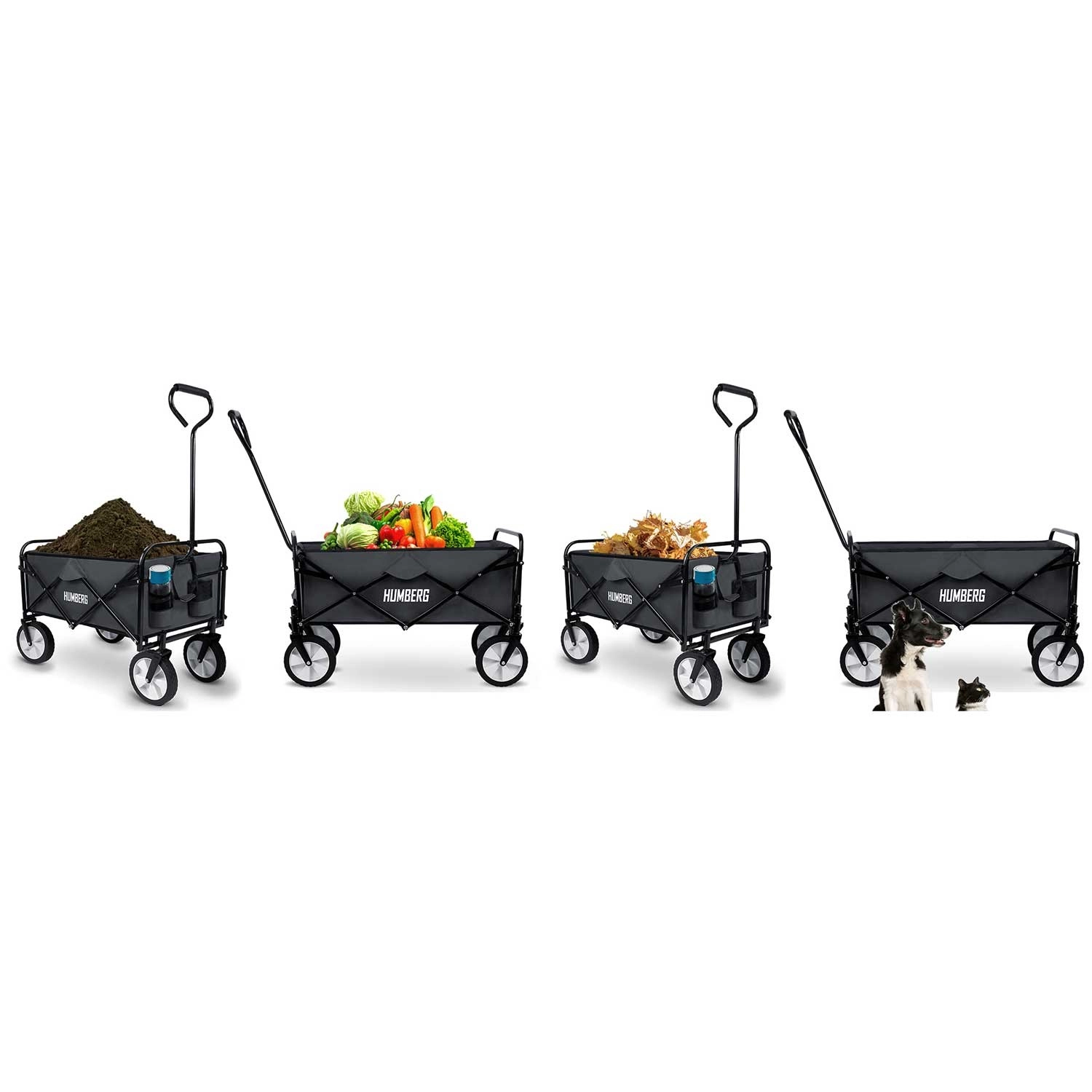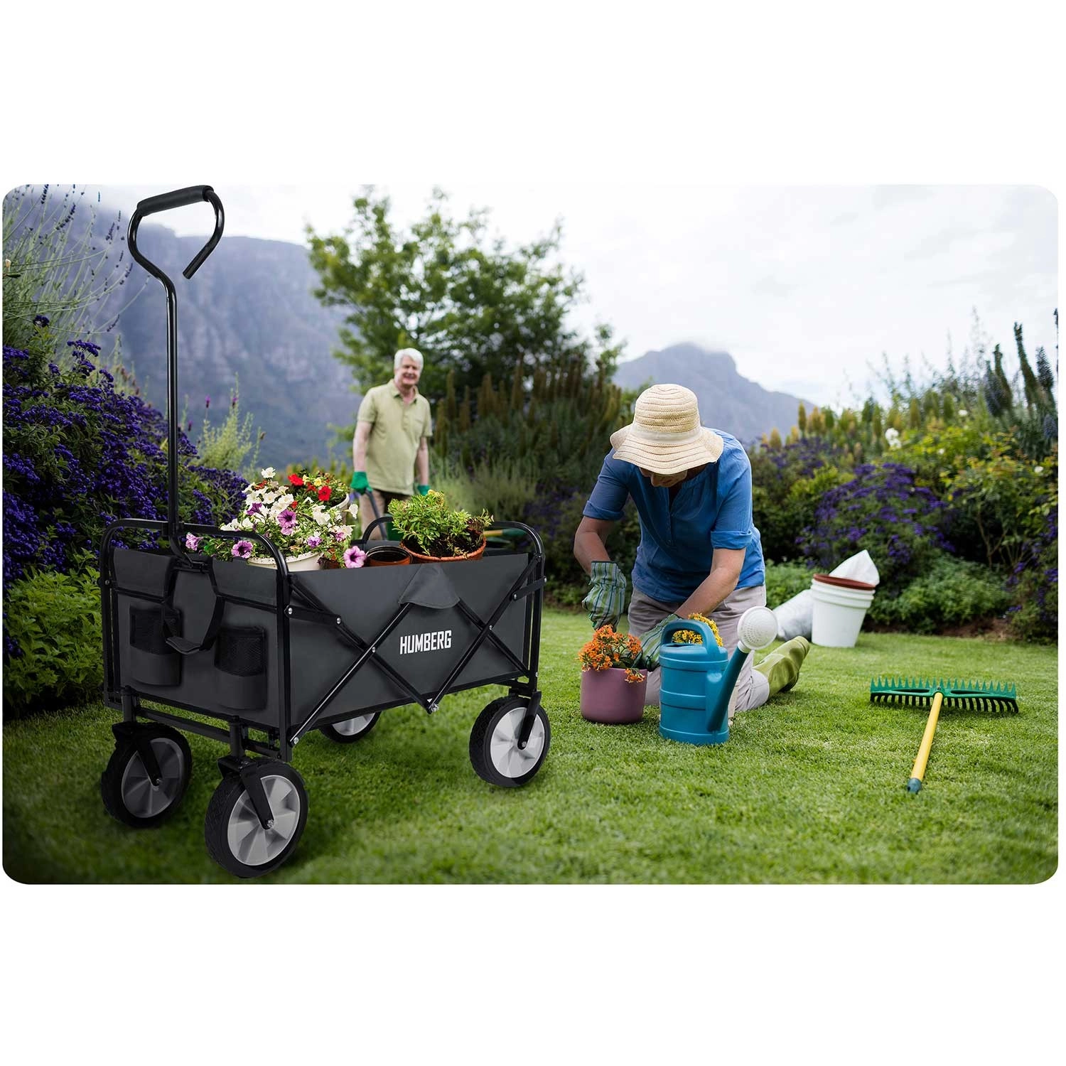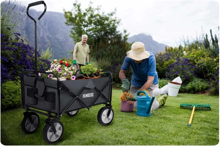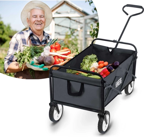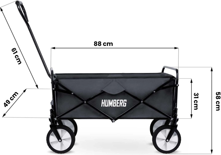 Le chariot pliable universel HUMBERG est l’assistant idéal pour le jardin, la plage comme pour les courses. Il offre un volume de 80 l, une capacité de charge jusqu’à 90 kg, un cadre en acier thermolaqué et un pliage rapide au format compact. Grâce à sa poignée télescopique confortable avec prise souple antidérapante et à ses roues avant pivotantes, il se manie facilement même à pleine charge. Il dispose aussi de poches pratiques pour boissons et d’un textile résistant et facile à nettoyer.
