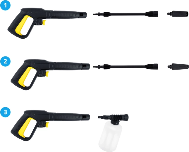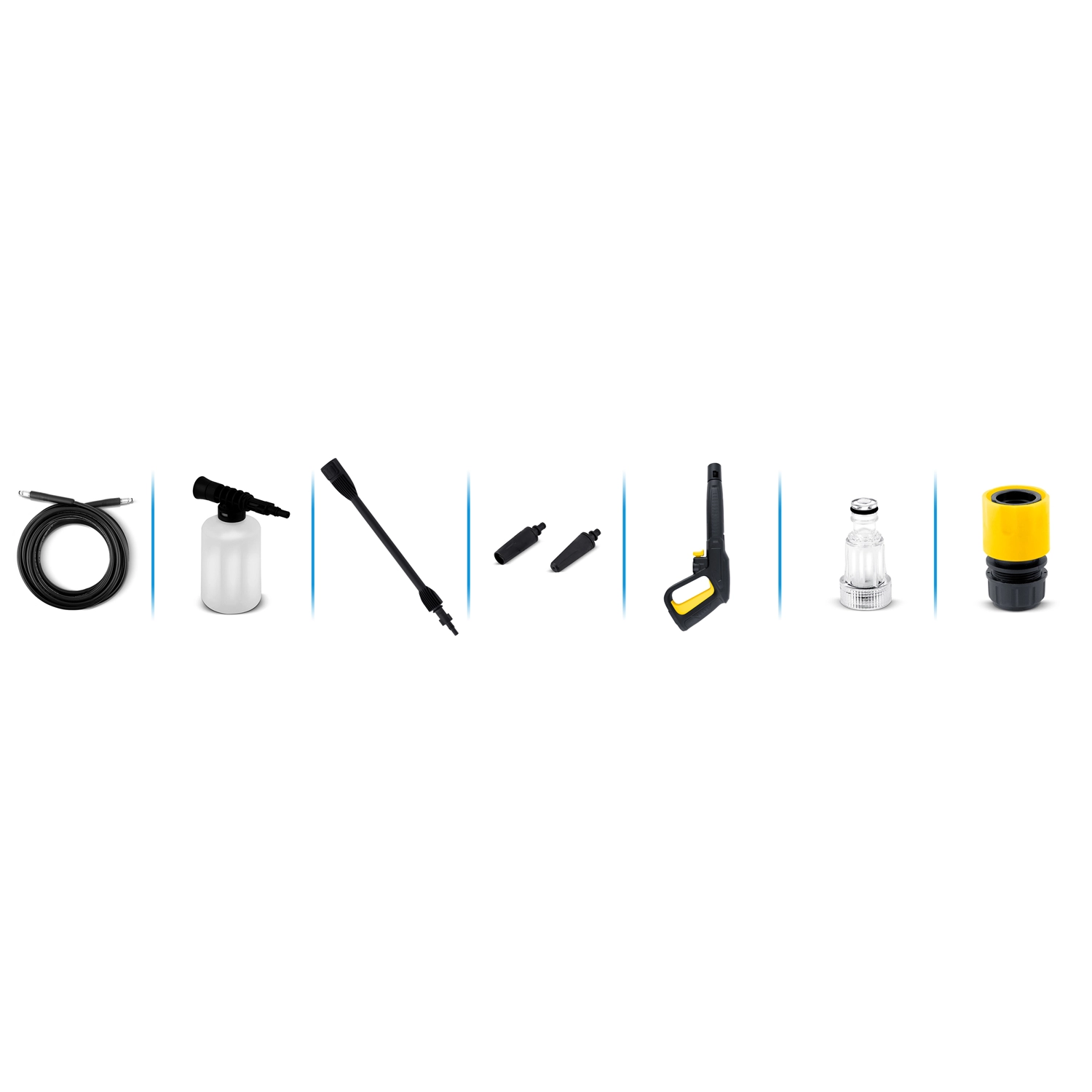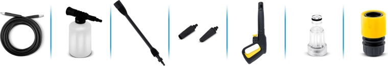 - lance avec buse réglable, buse turbo, tuyau haute pression 6 m, raccord d’eau, raccord rapide, bouteille de détergent 450 ml, aiguille de nettoyage des buses, câble d’alimentation 5 m