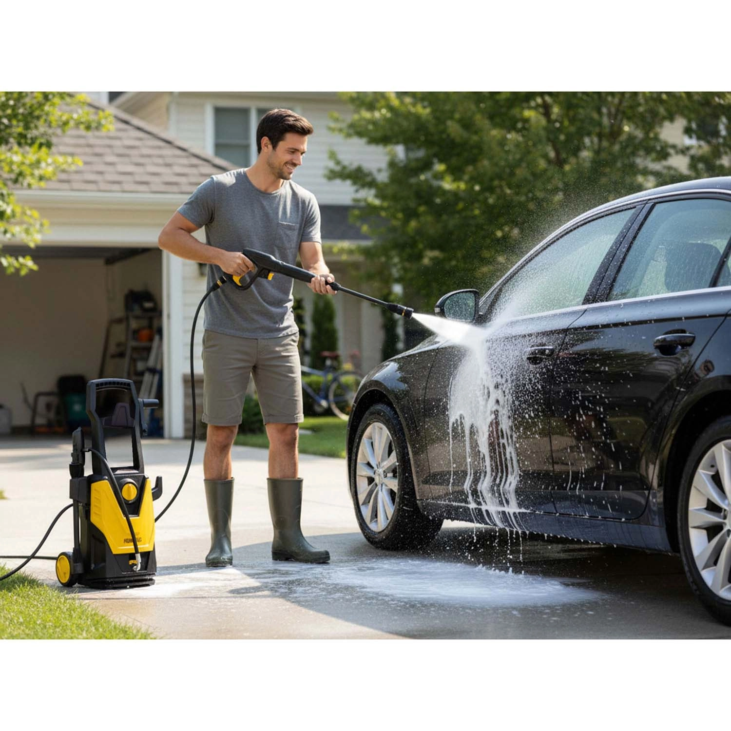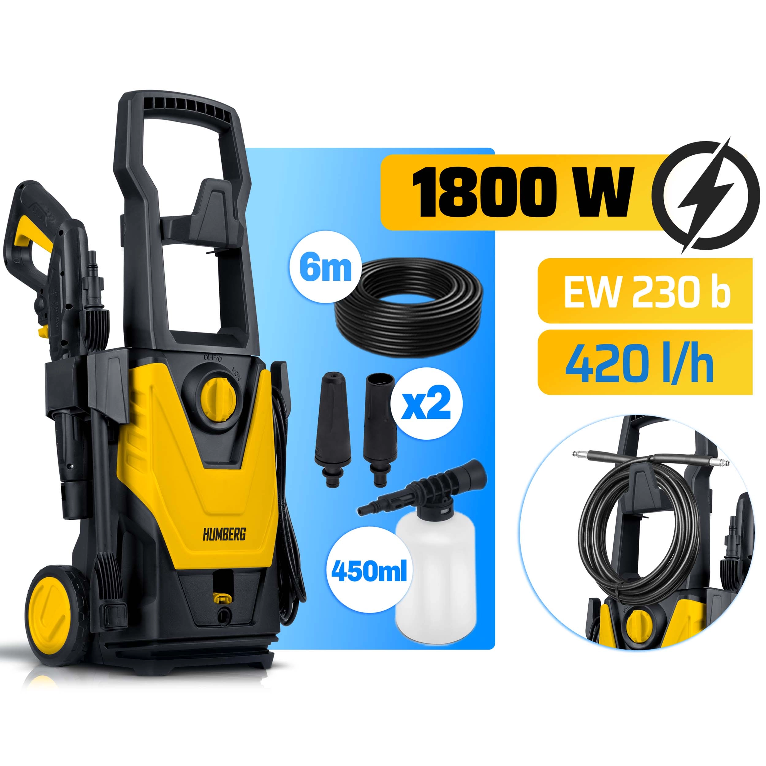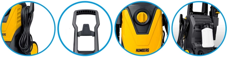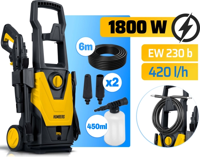 Le nettoyeur haute pression HUMBERG HM-300, compact et performant, avec moteur de 1800 W, pompe auto-amorçante en aluminium et pression jusqu’à 135 bars, s’occupe du lavage de la voiture, du dallage et de la terrasse. Il propose une buse réglable, une buse turbo TurboStream™, un moussant (450 ml), un tuyau haute pression de 6 m et un câble d’alimentation de 5 m. Le système StopAndSafe™ économise l’eau et l’énergie et prolonge la durée de vie de l’appareil, tandis que l’admission possible de l’eau chaude jusqu’à 60 °C améliore l’efficacité du nettoyage.