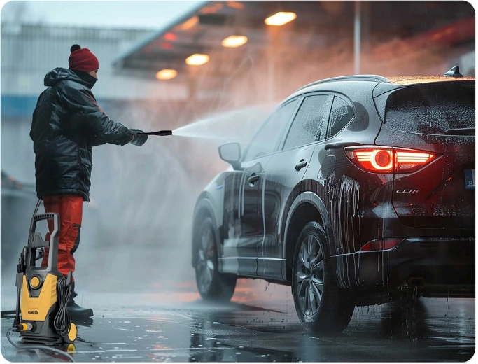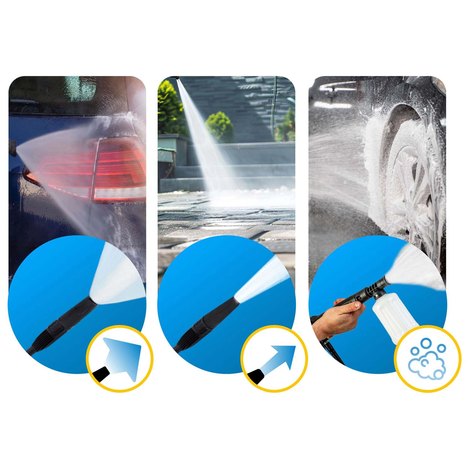 Passez à la buse turbo pour un jet concentré sur les saletés les plus tenaces ou utilisez le réglage progressif du jet en éventail pour un lavage délicat de la carrosserie et des vitres.