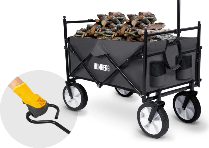 Vous cherchez une aide polyvalente pour transporter des charges ? Le chariot pliable HUMBERG offre un panier textile spacieux de 80 l, un cadre en acier robuste et de grandes roues pour une conduite stable sur diverses surfaces. Grâce à l’auvent réglable, il protège le contenu du soleil et d’une pluie légère, tout en préservant le confort lors du transport d’objets délicats.