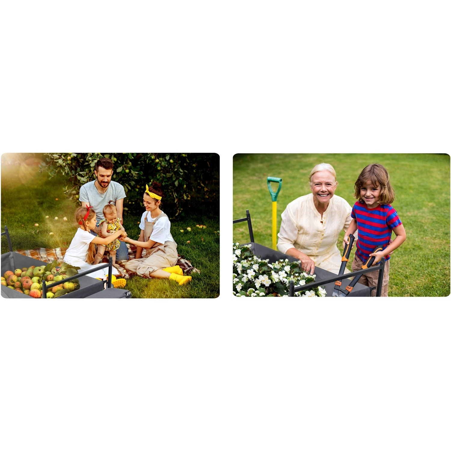 La poignée avec revêtement souple antidérapant assure une prise sûre même à pleine charge. Les roues avant pivotantes facilitent les virages et la tenue de cap précise. Après usage, pliez le chariot en un clin d’œil dans un format compact pour l’emporter en voiture, en vacances ou le ranger dans une armoire.