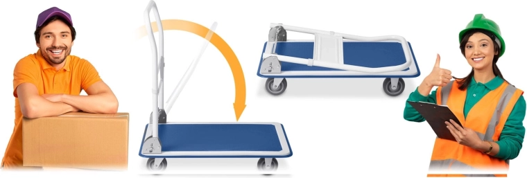 Grâce à sa poignée pliable, le chariot se range facilement sur une étagère ou dans le coffre d’une voiture, et son cadre en acier peint par poudrage résiste aux environnements exigeants. Le rebord caoutchouté de protection amortit les chocs et évite les rayures sur les meubles et les murs lors des déménagements.