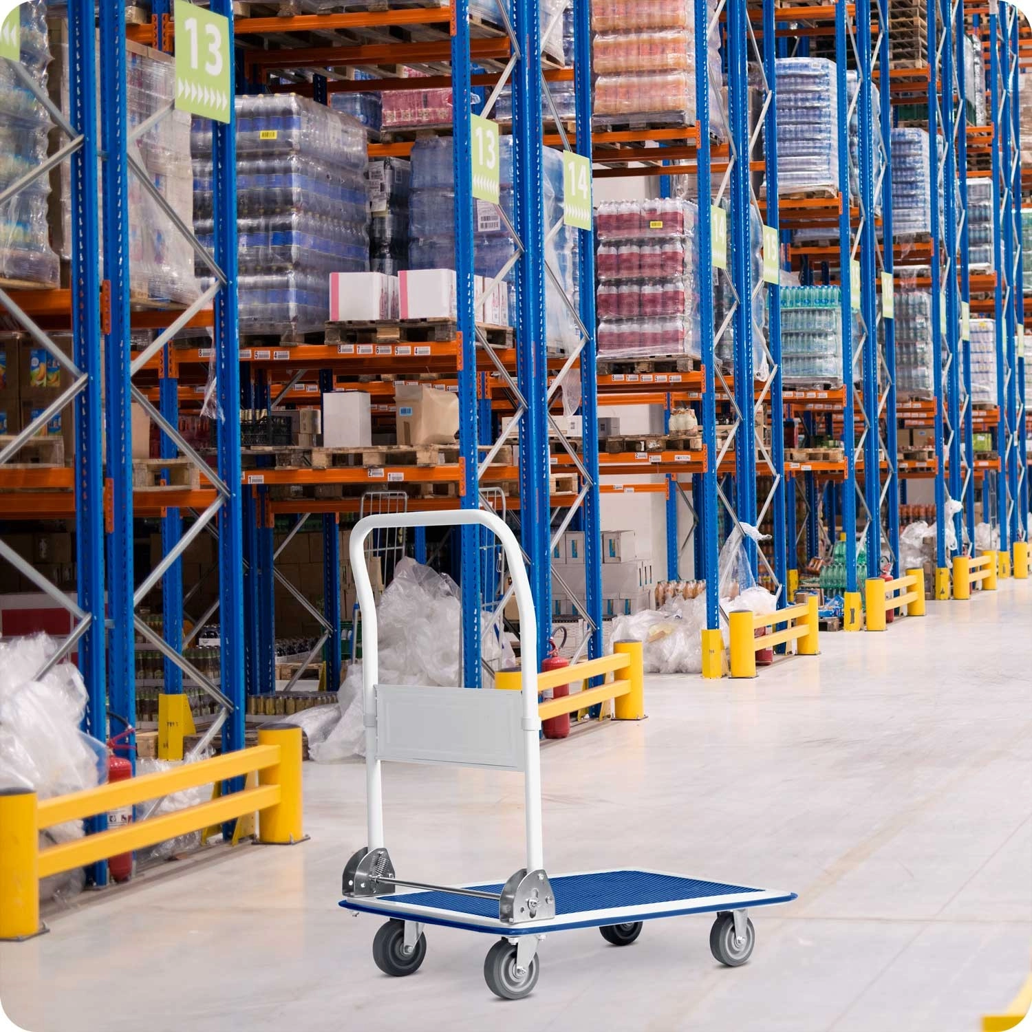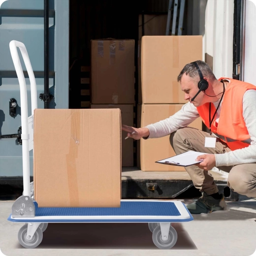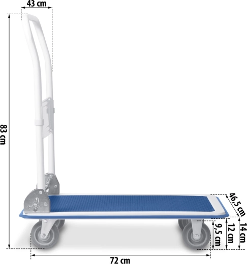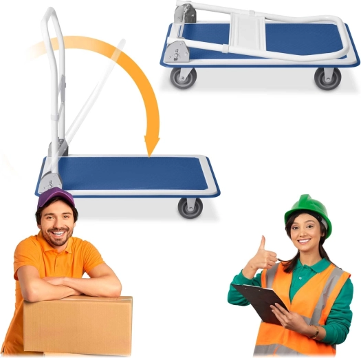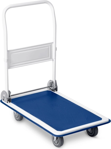 Chariot à plateau compact et robuste avec une capacité de charge allant jusqu’à 150 kg, facilitant le déplacement de cartons et de marchandises en entrepôt, en magasin comme à la maison. Il offre une poignée ergonomique pliable, une plateforme antidérapante en PVC et des roulettes pivotantes en caoutchouc pour des manœuvres fluides. Un cadre en acier peint par poudrage et un rebord de protection en caoutchouc garantissent une longue durée de vie et une manipulation sûre.