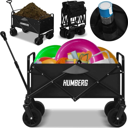 Pratique, le chariot pliable HUMBERG d’un volume de 100 l et d’une capacité de charge jusqu’à 120 kg facilite le transport des charges au jardin, à la plage comme en voyage. Grâce aux roues pivotantes à 360°, à la poignée télescopique et à la structure en acier stable, il se manie aisément même sur terrain irrégulier. Pliage rapide, tissu résistant et poches porte-boissons pratiques en font un aide indispensable au quotidien.