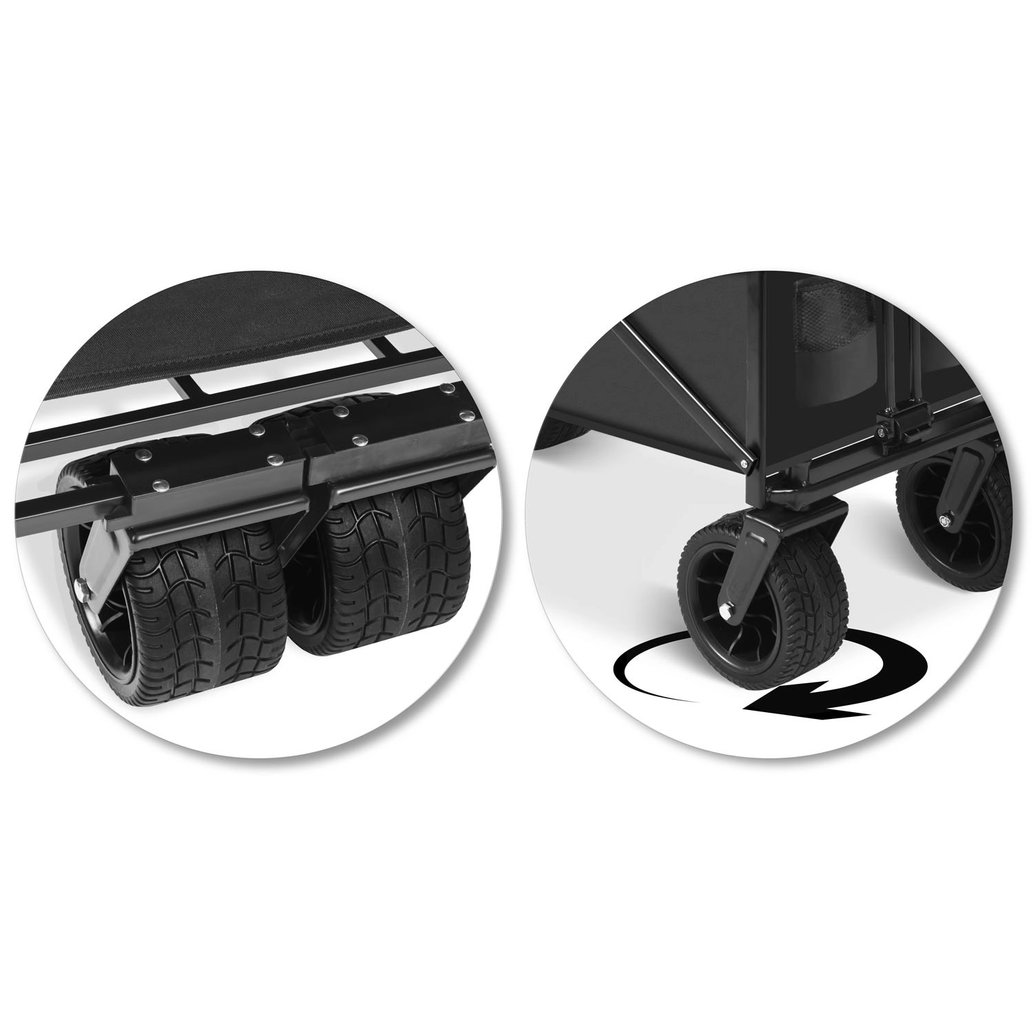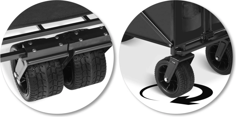 Avant pivotantes à 360°, grandes roues tout-terrain