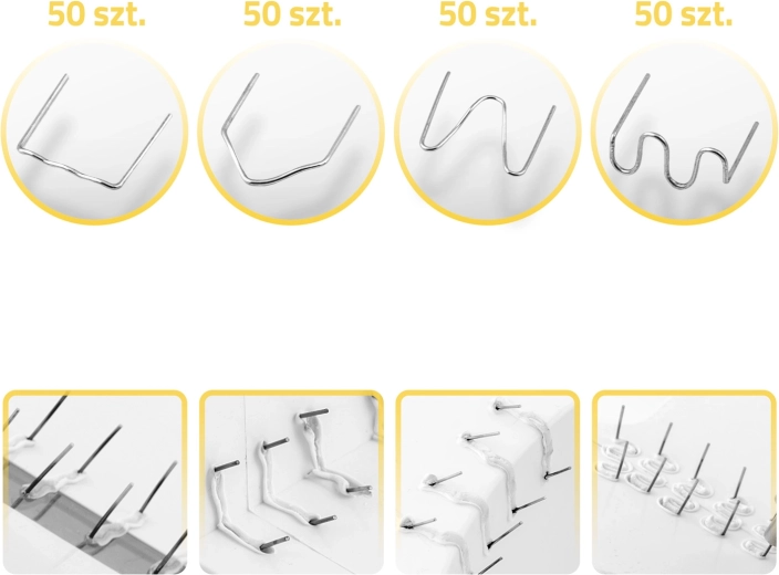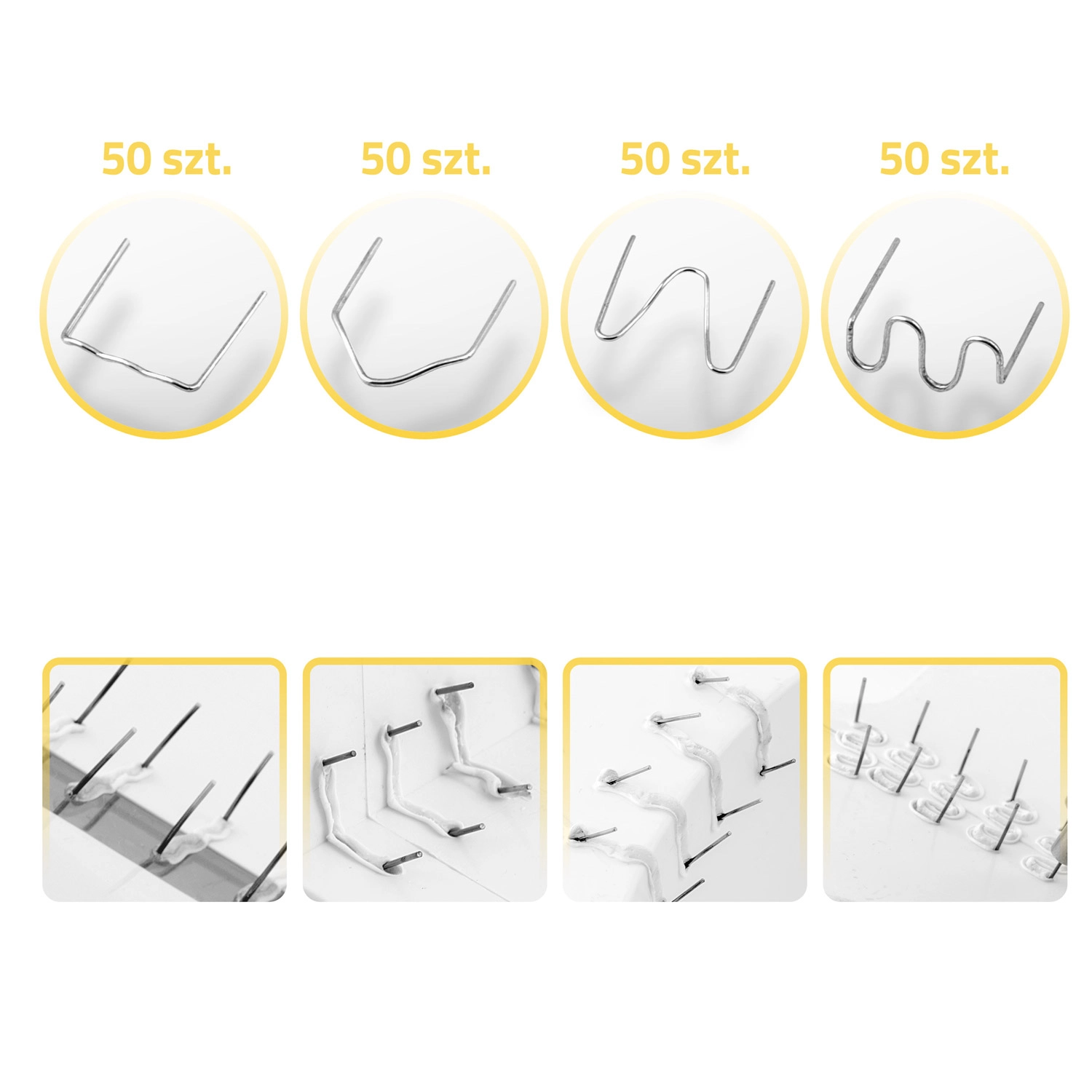 Le coffret contient 200 agrafes : plates avec petit et grand rayon, d’angle convexe et concave – pour les fissures longitudinales, d’angle et les ruptures plus étendues.