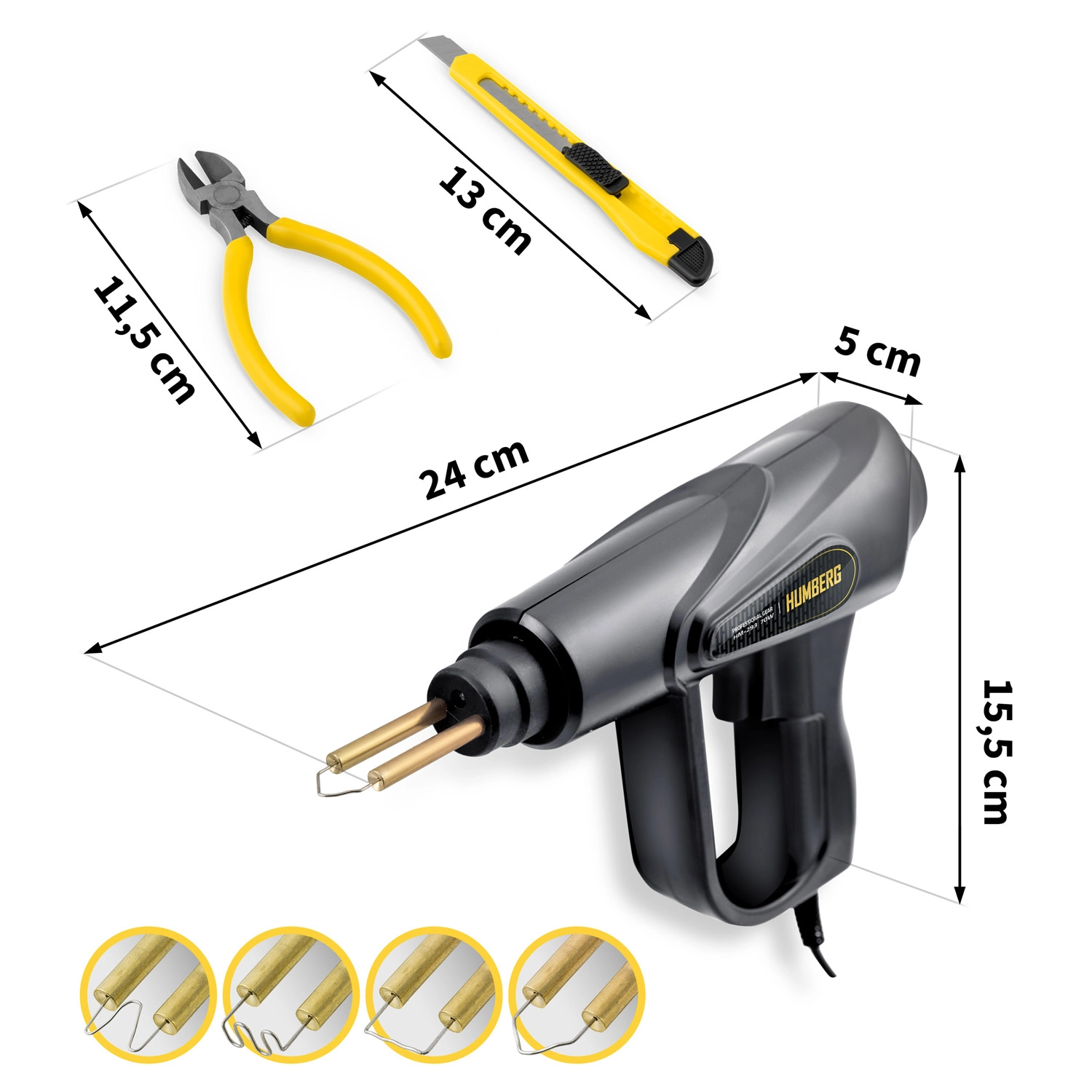 Soudeuse de plastiques compacte HUMBERG 70 W dans une mallette robuste, solution rapide pour la réparation de pare-chocs, optiques, tableaux de bord et capots d’appareils. Elle chauffe en 3 secondes jusqu’à 400 °C, convient à plus de 98 % des plastiques et est fournie avec 200 agrafes en 4 types, éclairage LED, pince coupante et cutter à lame sécable pour une finition propre.
