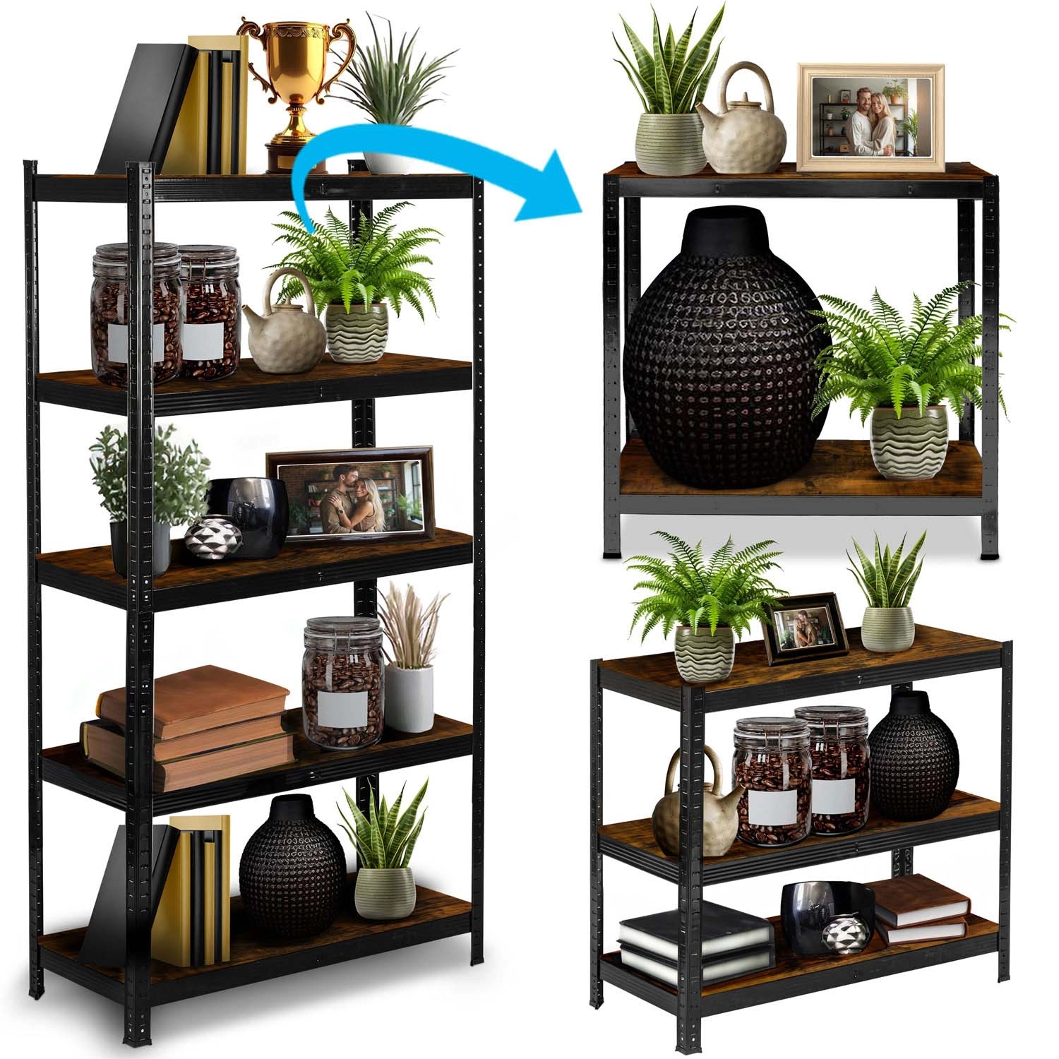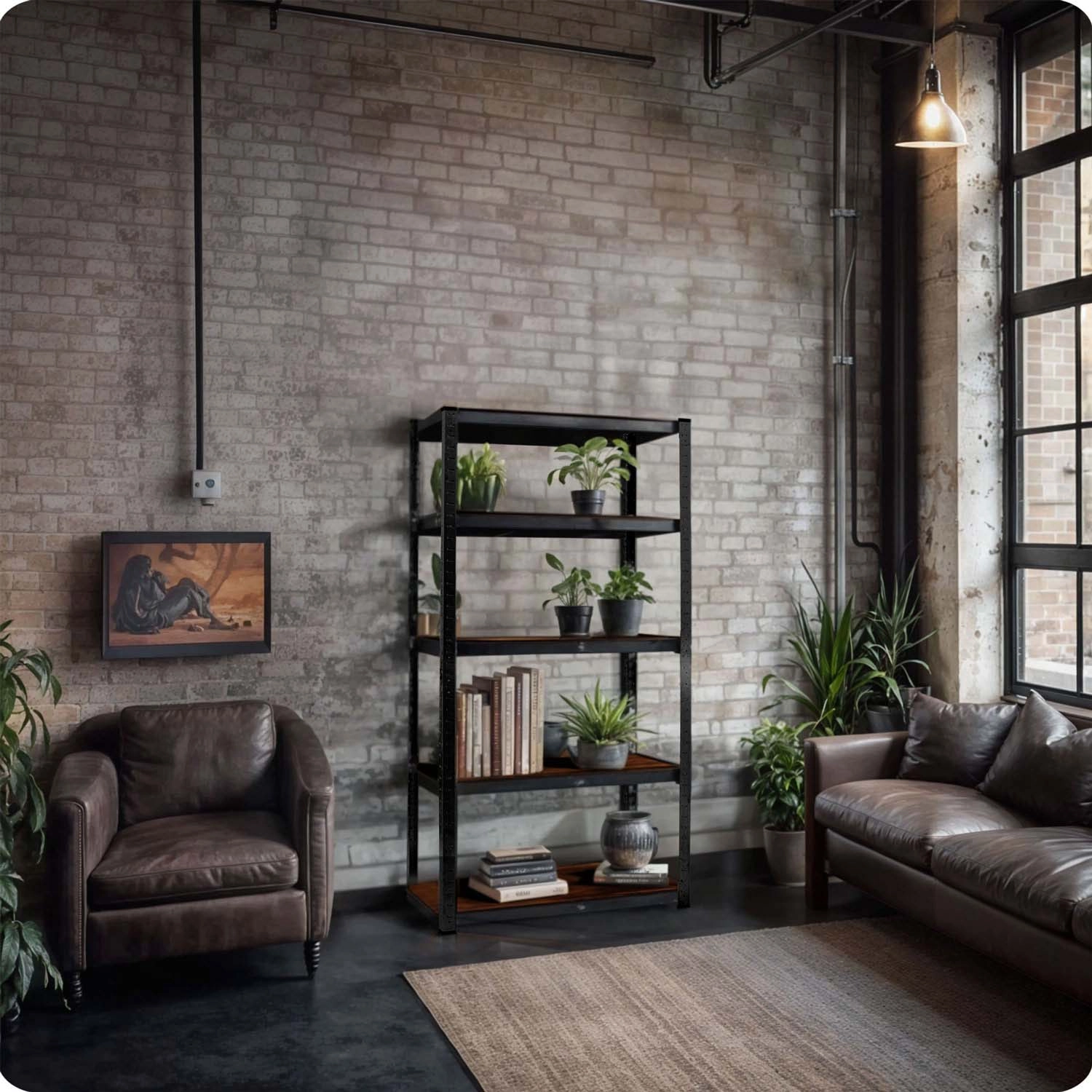 Profils en acier galvanisé avec peinture epoxy noire et tablettes en MDF au style rustique, faciles à entretenir, idéales pour le garage, l’atelier et les intérieurs modernes.